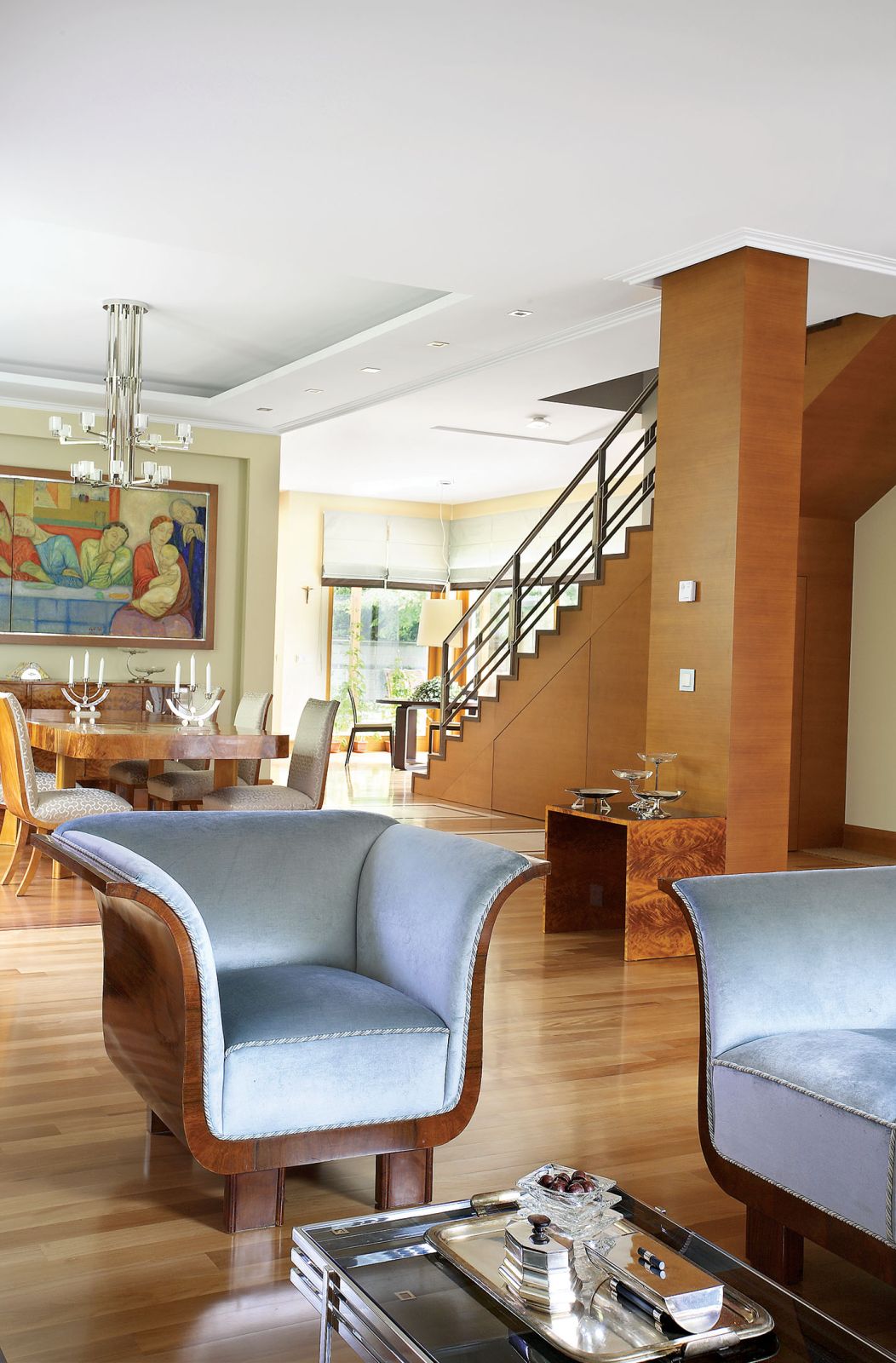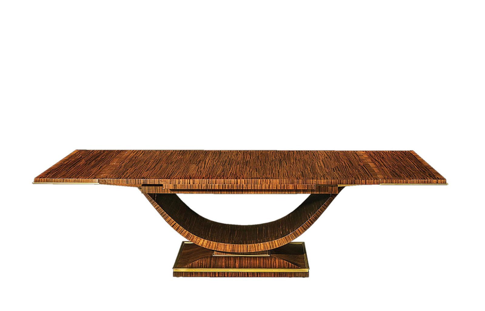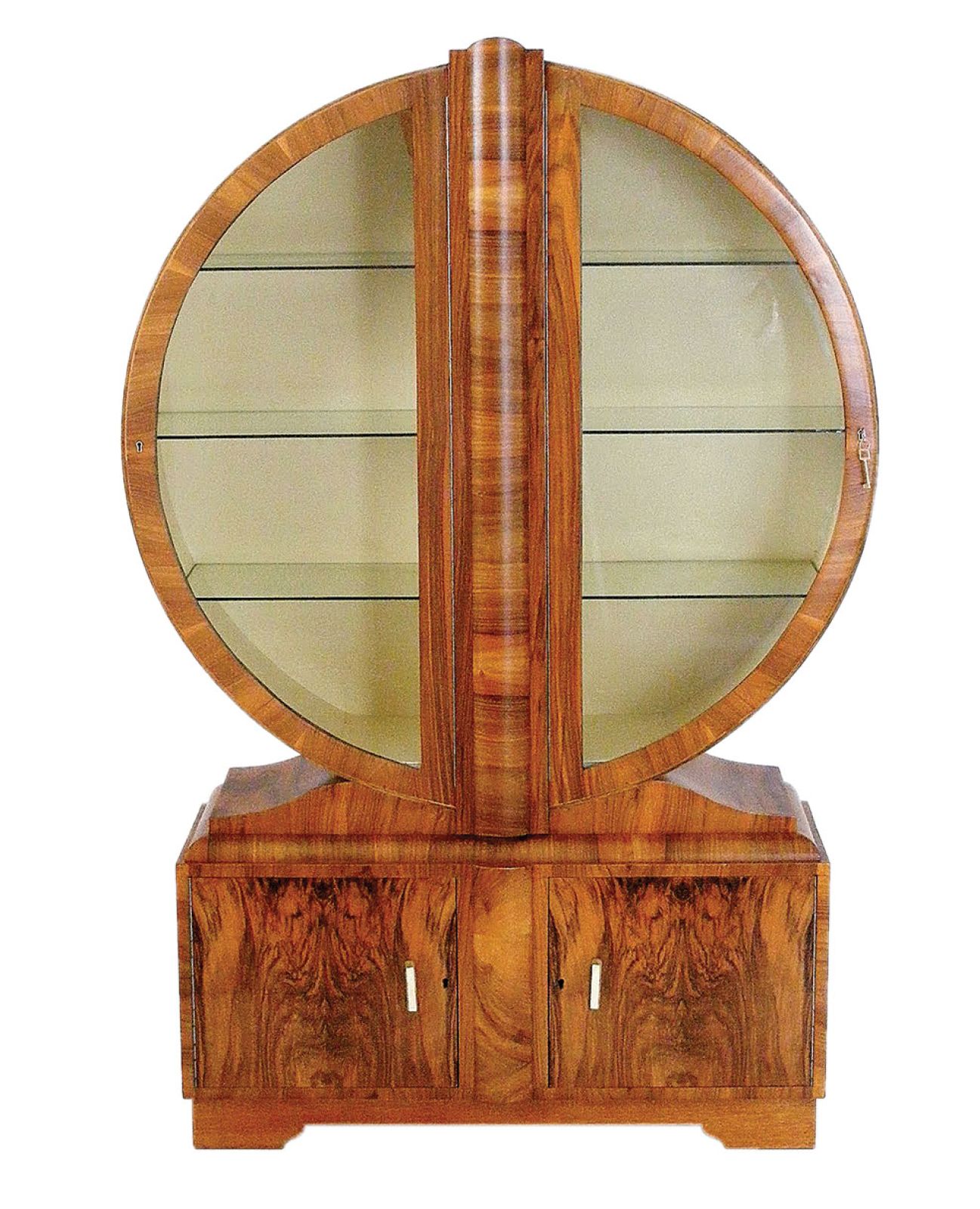 Solidne, wręcz masywne, mają często zao- krąglone formy (np. wywijające się na zewnątrz ni- czym kielich kwiatu oparcia). Popularne są konsole i stoły z półkolistą podstawą, okrągłe witryny, smukłe niczym drapacze chmur biblioteczki o schodkowej budowie. Meble mają chromowe, złocone i mosiężne wykończenia, często też elementy z tworzyw sztucznych czy kości słoniowej. Obowiązkowy jest stolik kawowy, przeważnie ze szkła i metalu, także giętego.
