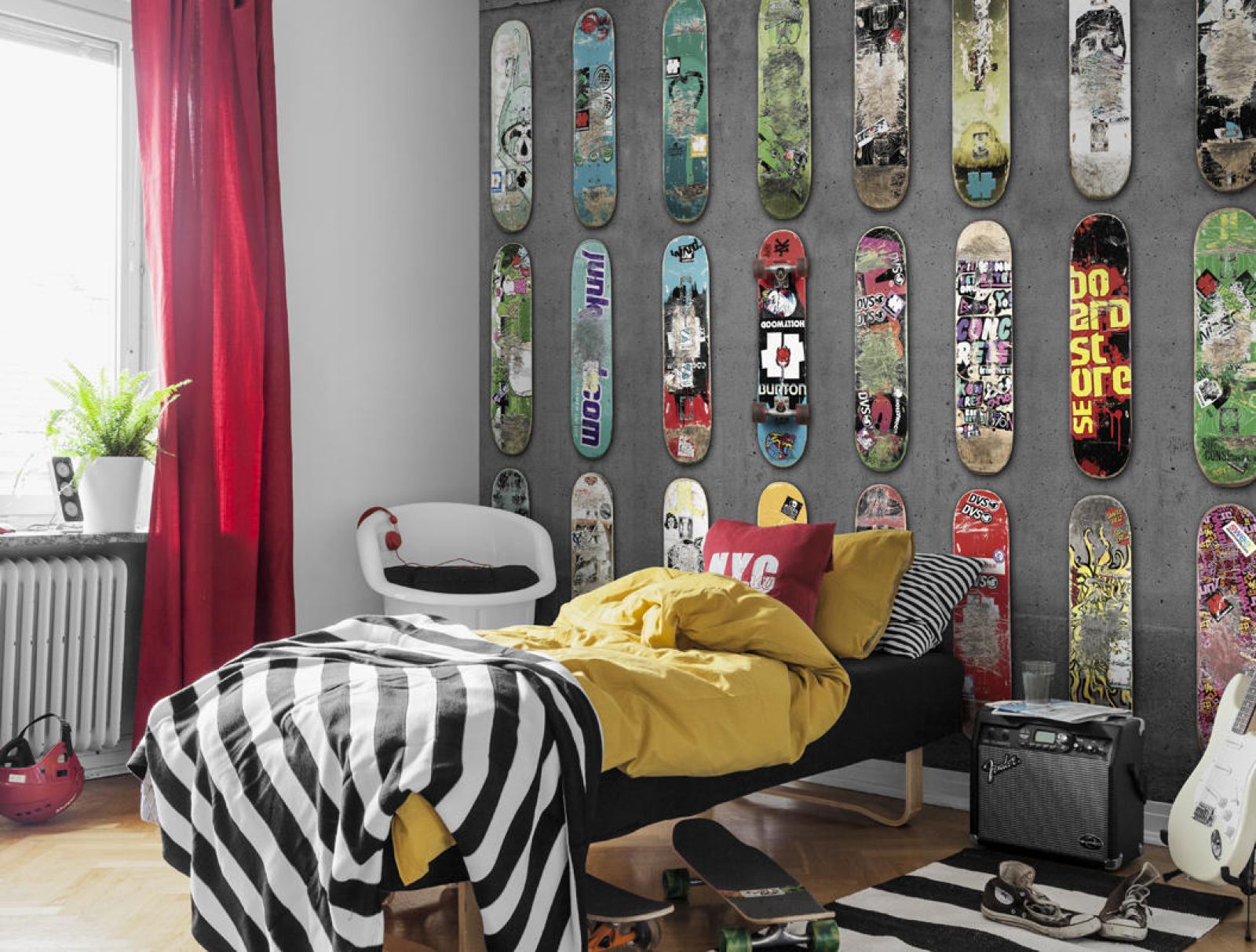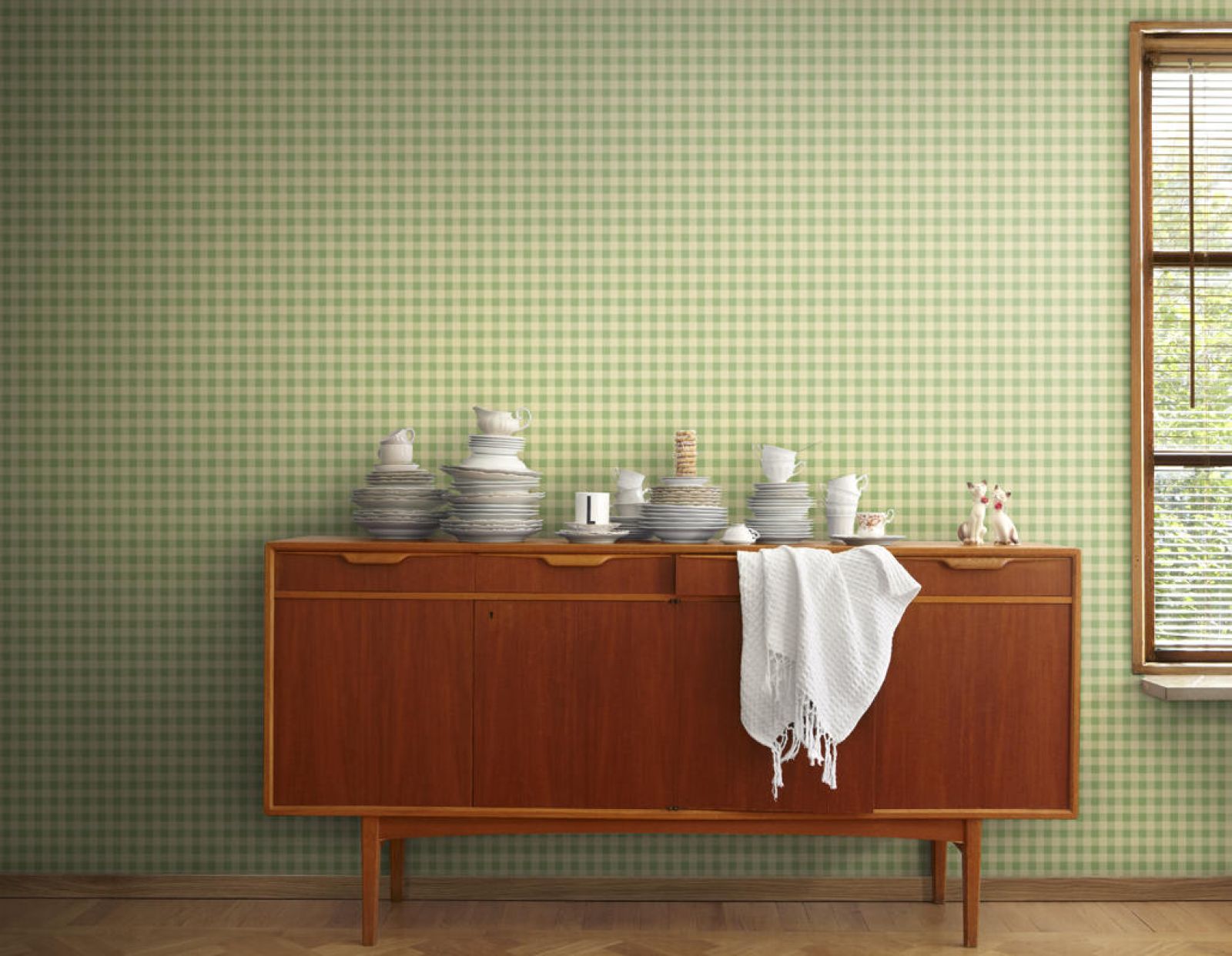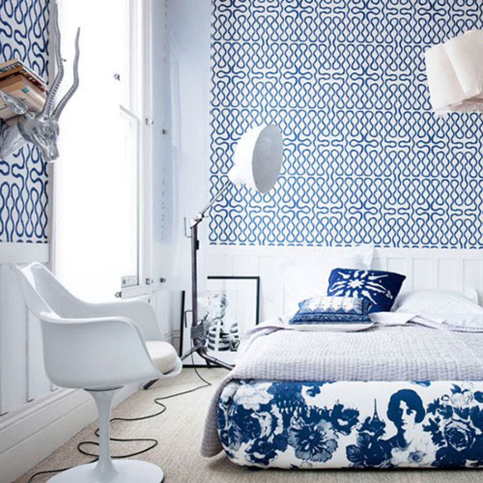 - Za wysoki i mało przytulny pokój? Połóż na ścianach tapetę w kratę lub inne geometryczne (gęste) wzory. To sprawi, że sufit będzie sprawiał wrażenie niższego.
