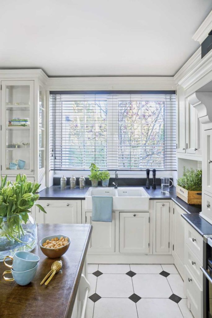 Małe okna w ciemnej kuchni zasłoń tylko częściowo. Sposobem naszych babć było wieszanie zazdrostek – czyli zasłonek montowanych w połowie wysokości okna. Zainspiruj się nimi, jeśli lubisz przytulne wnętrza. Taka zasłonka doda kuchni rustykalnego charakteru, budząc skojarzenia z górską chatką.