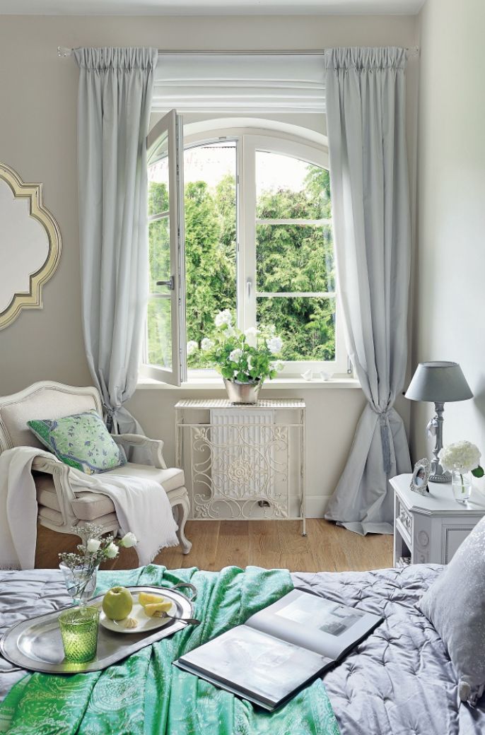Zamiast koronkowych lub wzorzystych firan, powieś na oknie kawałek półprzezroczystej tkaniny – przewieszony luźno przez karnisz doda twojej sypialni lekkości i miękkości. Takie rozwiązanie sprawdzi się, kiedy okna twojej sypialni znajdują się od strony zachodniej lub północnej i nie ma potrzeby blokowania dopływu światła.