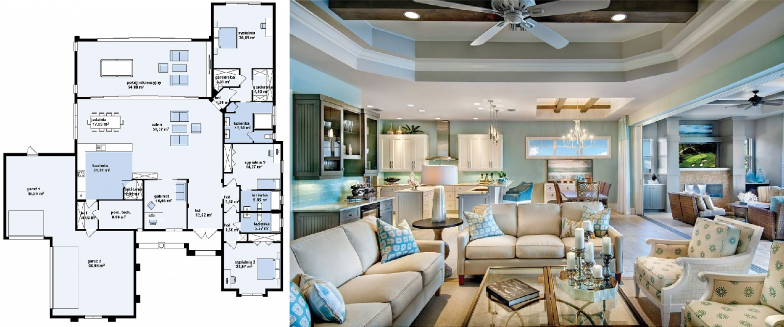 Wnętrze ze zdjęcia nr 2 (galeria) utrzymane jest w stylu glamour, ale posiada również akcenty śródziemnomorskie, klasyczne, a nawet rustykalne. Motywem przewodnim są tutaj błyszczące powierzchnie i szlachetne materiały (obicia i dodatki). Całość oscyluje wokół chłodnych beżów, morskiego błękitu, bieli i złota. Na uwagę zasługuje aranżacja przestrzeni sufitu, który nie jest jednolity – posiada zróżnicowaną formę oraz oświetlenie.