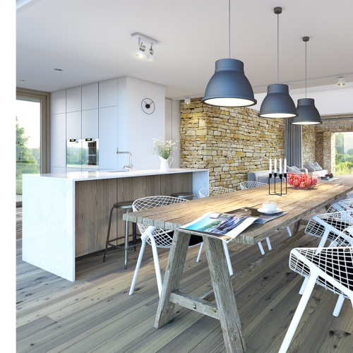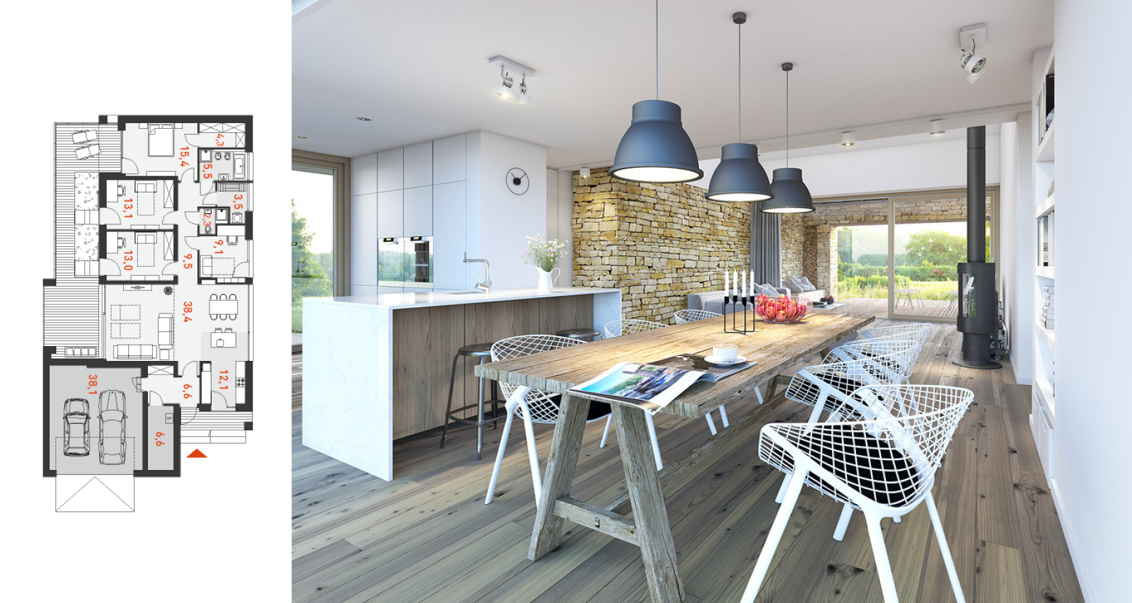 Aranżacja w skandynawskim stylu, pełna naturalnych materiałów, światła i prostych form. Charakteru dodaje tutaj surowe drewno stołu w jadalni i rustykalny kominek wolnostojący w salonie. W aranżacji wykorzystano również bardzo nowoczesne elementy w loftowym stylu: ażurowe krzesła, minimalistyczne lampy wiszące czy proste świeczniki bez zbędnych zdobień. Urozmaiceniem całości są wyłożone kamieniem dekoracyjnym ściany w salonie. Co ciekawe, kamień ten znajduje się także na elewacji domu, co świetnie łączy wnętrze z całą bryłą budynku. Przestrzeń jest otwarta, bardzo funkcjonalna i świetnie doświetlona dzięki dużym przeszkleniom (które jednak nie wprowadzają dyskomfortu, ponieważ nie zajmują dużej powierzchni). Podobnie jak poprzednia aranżacja, ta również dotyczy układu z gotowego projektu, bez wprowadzania żadnych zmian.