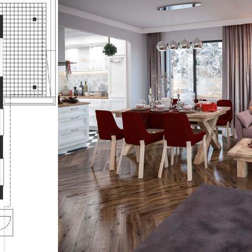 Taka aranżacja nie może przejść bez uwagi (zdjęcie nr 4 w galerii). To świetne połączenie nowoczesnej, otwartej przestrzeni domu parterowego, z typowo rustykalnymi, wiejskimi elementami. Najważniejszą rolę pełni tutaj przepiękny, drewniany parkiet z widocznym usłojeniem oraz zestawienie barw. Zgaszony, różowy fiolet zastosowany w komplecie wypoczynkowym, świetnie kontrastuje z ciemnoczerwonym materiałem obiciowym na krzesłach. Fiolety i róże zostały przełamane także dodatkami w metalicznych kolorach i drewnem na meblach. Elementami balansującymi przytulny charakter są połyskliwe zasłony, nowoczesne i surowe lampy nad stołem w jadalni oraz proste formy mebli. Otwarta kuchnia została tutaj nieformalnie oddzielona za pomocą zróżnicowanej podłogi (piękna, klasyczna krata), kolorystyki i intensywniejszego oświetlenia.