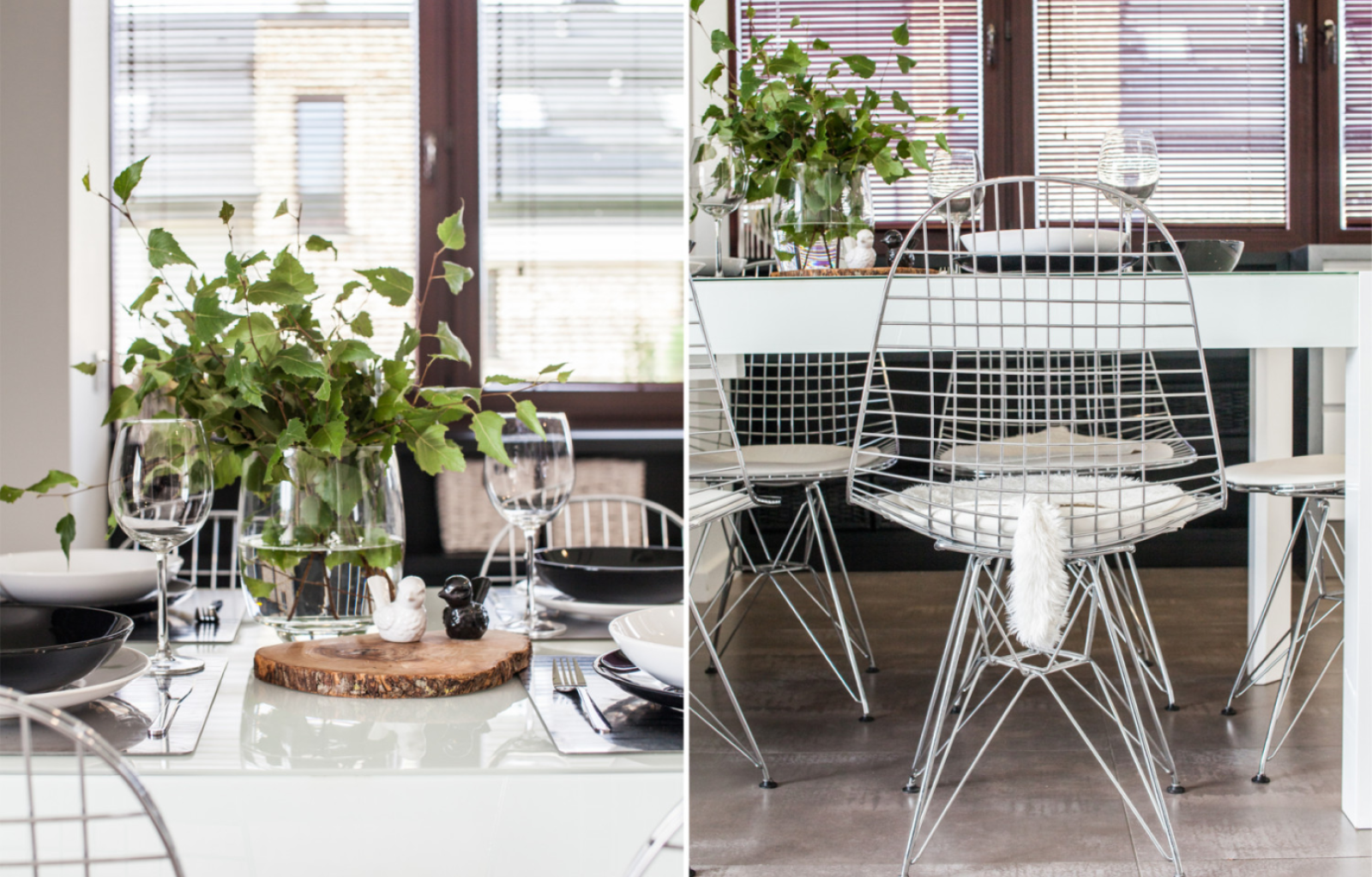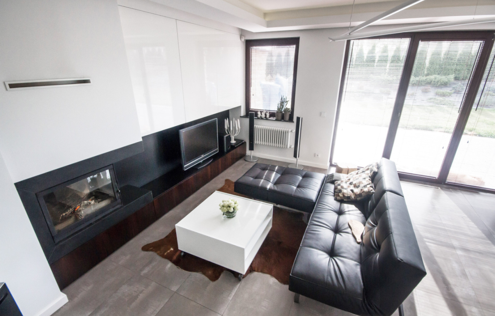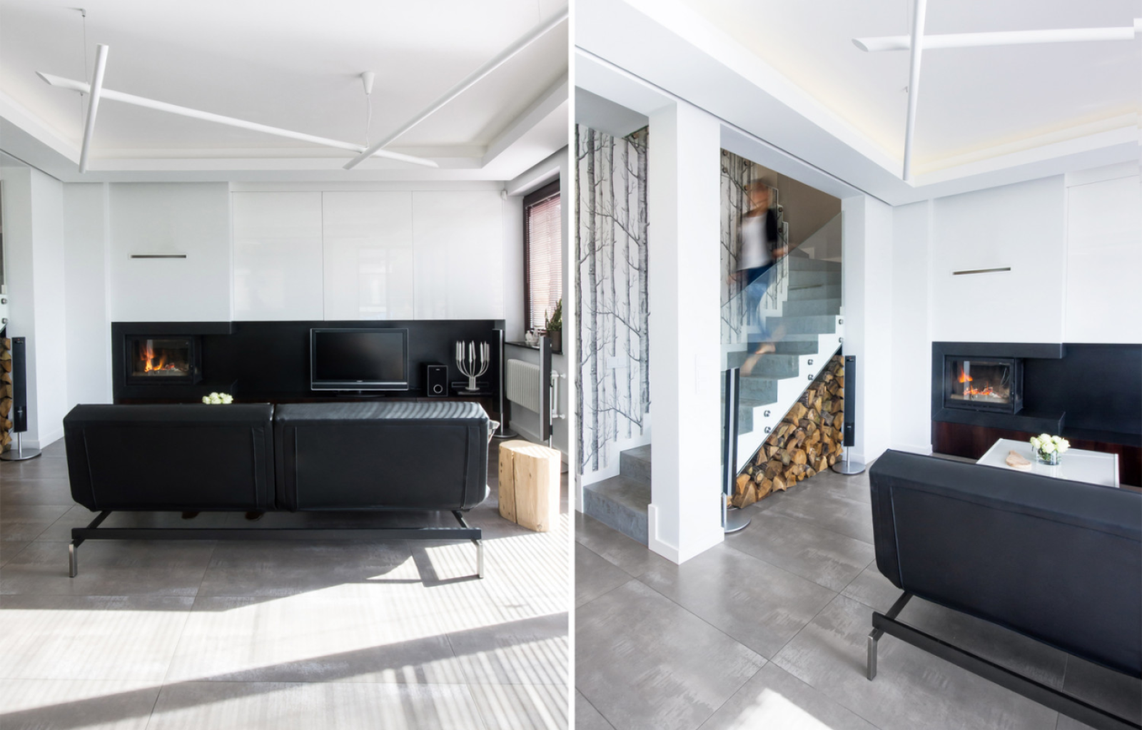 W całym 158-metrowym domu – zarówno w wyposażeniu, jak i ogólnej stylistyce – dominują biel i czerń. By uniknąć „chłodu” i pustki zastosowano naturalne dodatki – kwiaty, stołki z pieńków, drewniane gałęzie uczepione do nowoczesnego oświetlenia, dywany oraz narzuty imitujące wyprawioną skórę. W bardzo minimalistycznym salonie uwagę skupia kominek, który przełamuje dość surowy wyraz i wprowadza do wnętrza przyjemną, delikatną przytulność.