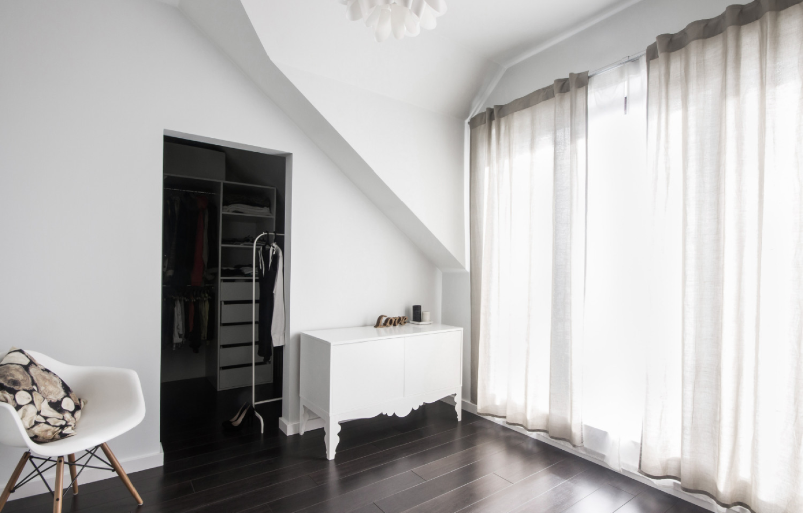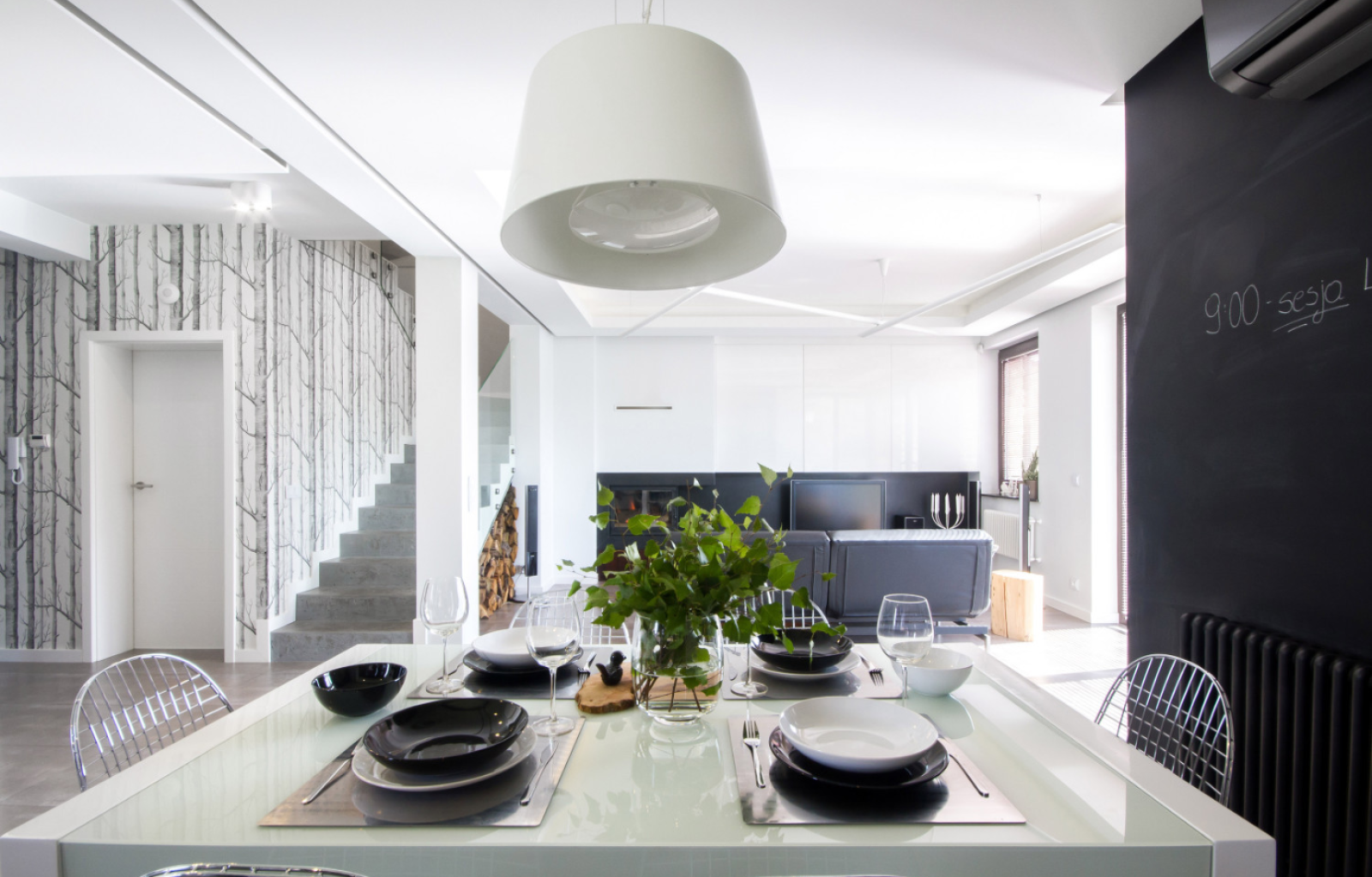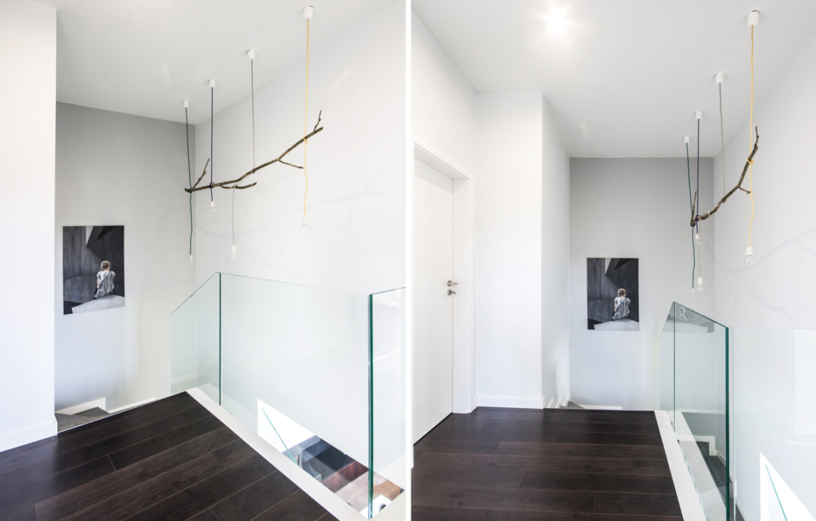 W całym 158-metrowym domu – zarówno w wyposażeniu, jak i ogólnej stylistyce – dominują biel i czerń. By uniknąć „chłodu” i pustki zastosowano naturalne dodatki – kwiaty, stołki z pieńków, drewniane gałęzie uczepione do nowoczesnego oświetlenia, dywany oraz narzuty imitujące wyprawioną skórę. W bardzo minimalistycznym salonie uwagę skupia kominek, który przełamuje dość surowy wyraz i wprowadza do wnętrza przyjemną, delikatną przytulność.