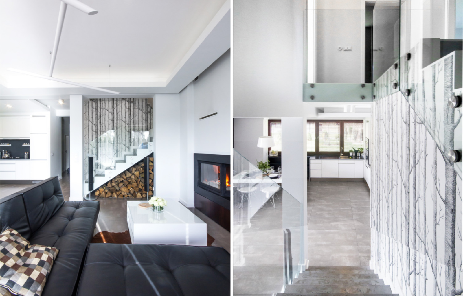 Architektki śmiało łączą tu zresztą rozmaite struktury i faktury. Drewno, szkło, metal. Interesująco wygląda ściana przy schodach, na której położono graficzną tapetę z motywem brzozowych pni marki Cole& Sun. Ciekawostką jest, że zaprojektowana została przez Michaela Clarksa 1959 roku - pierwotnie w postaci sitodruku. Ten wzór sprawdzi się znakomicie zarówno w nowoczesnym, minimalistycznym wnętrzu - co widać na przykladzie tego domu, ale także i w stylowym, klasycznym otoczeniu.