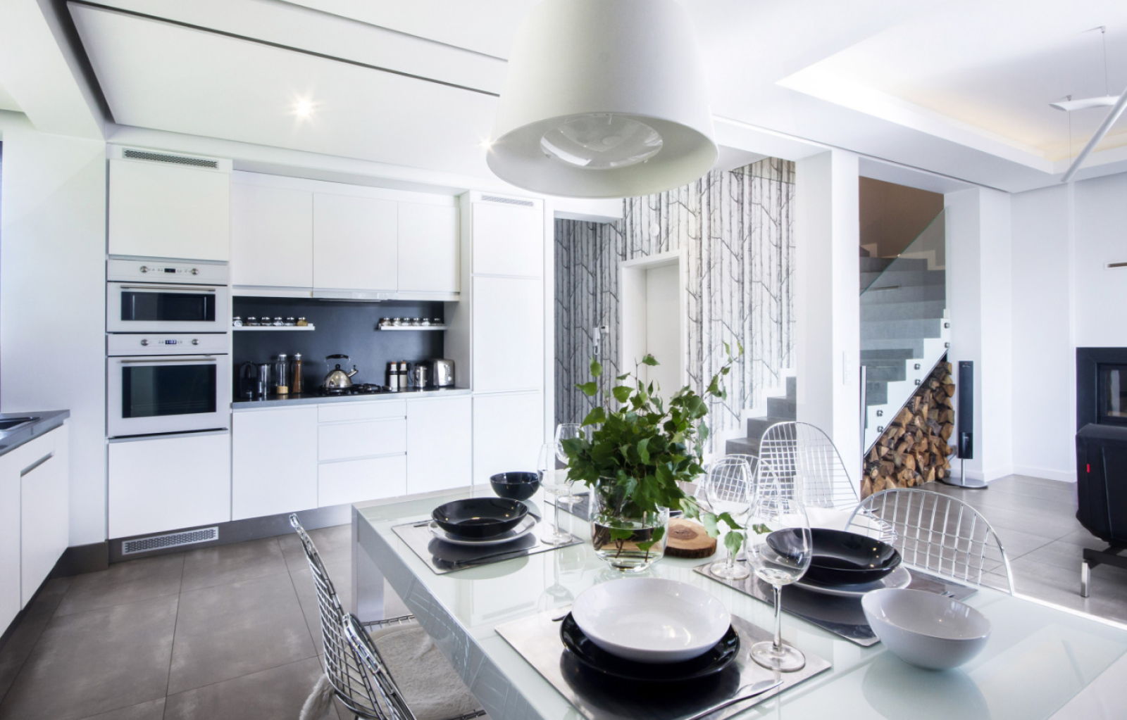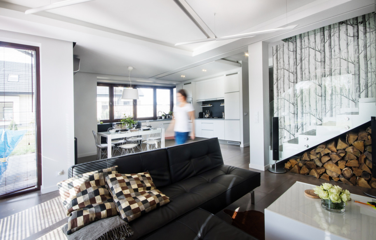 W krakowskim domu zastosowano kilka ciekawych rozwiązań. Parter stanowi właściwie jedną wielką przestrzeń – bez żadnej ściany, na której znalazły się kuchnia z jadalnią oraz strefa wypoczynkowa z wyjściem na taras (poszczególne strefy zaznaczone są jedynie odpowiednim ustawieniem mebli).