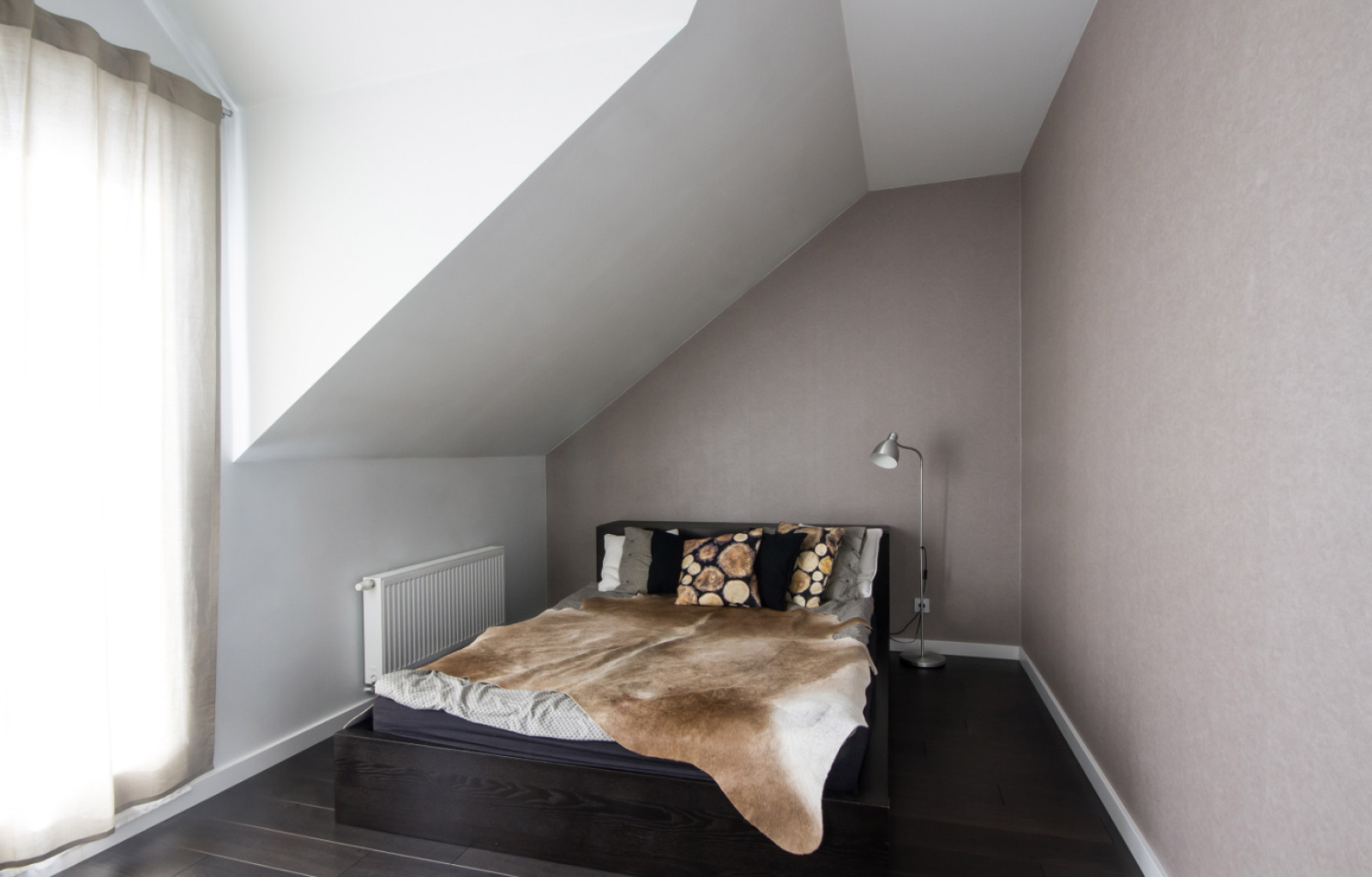 Piętro ma zdecydowanie cieplejszy i intymniejszy klimat – na pewno także za sprawą ciemnych drewnianych desek na podłodze. Sypialnia (z wydzieloną garderobą) jest prosta, ocieplona beżami na ścianie oraz "drewnianymi" i skórzanymi tekstyliami. Minimalistyczną łazienkę dynamizują z kolei żółte fragmenty ścian.