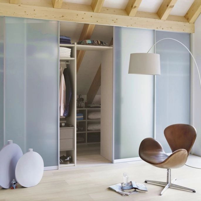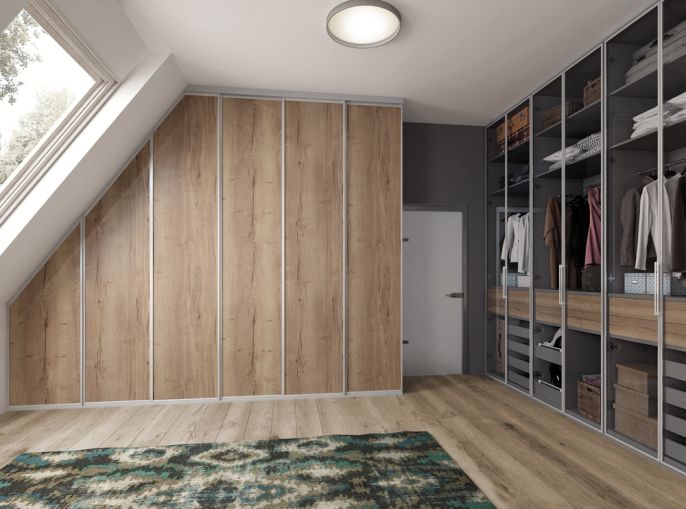 Zdjęcie główne: szafa z drzwiami przesuwnymi w aluminiowych profilach Lazuryt, do zabudowy pod skos, komandor.pl, zdjęcie niżej: garderoba zabudowana w skosie, aranżacja marki Raumplus, raumplus.pl