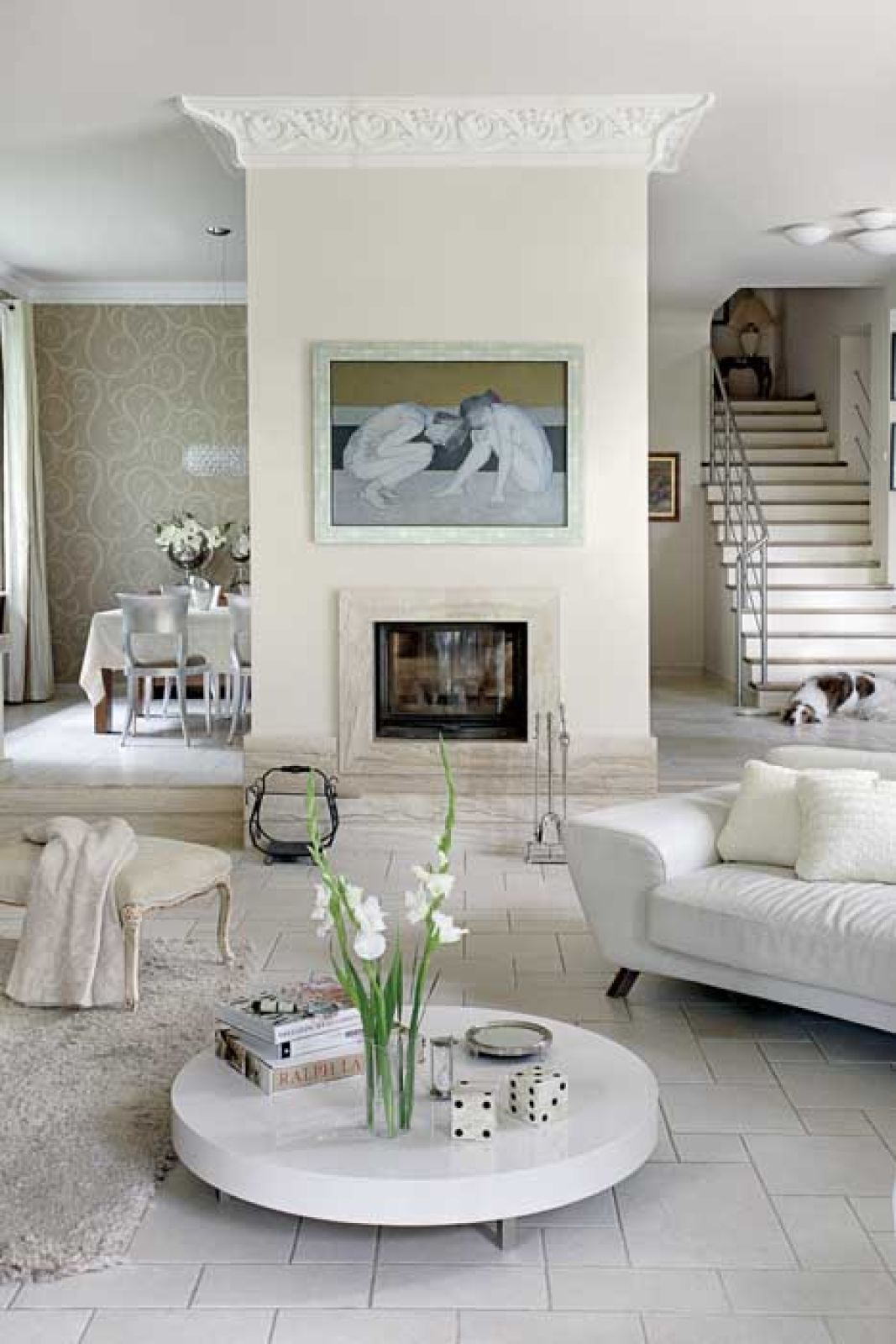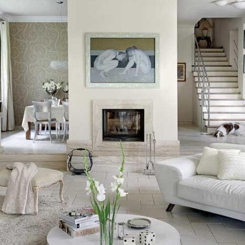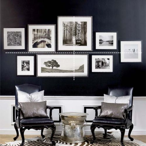 Jeśli mamy duży, ciekawy obraz, wieszamy go na środku ściany. Tak jak te nad kominkami w galerii zdjęć. Uwaga – nie za wysoko! Obraz powinien być na linii oczu. Wieszanie obrazów zbyt wysoko to błąd! Jeśli mamy kilka małych obrazków, wybieramy centralny punkt na ścianie, na przykład nad stołem czy kanapą, i wyznaczamy poziomą linię, a przez jej środek – pionową, która powinna mieć dwa takie same ramiona.