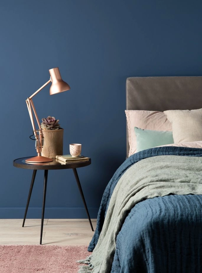 Ten odcień dobrze komponuje się w sypialni z pudrowym różem, błękitnem, beżem, jasną szarością, doskonałe zestawienie tworzy z czernią i bielą. Na tle granatowej ściany pięknie wybrzmią mocne kolory dodatków oraz bogate wzory poduch i pościeli. Fuksja, czerwień, butelkowa zieleń lub żółty stworzą akcenty kolorystyczne, które idealnie sprawdzą się i w małej przestrzeni, i w bardziej przestronnym wnętrzu.