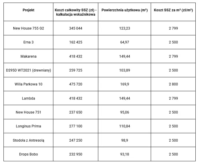 Porównanie kosztów budowy do SSZ na podstawie gotowych projektów