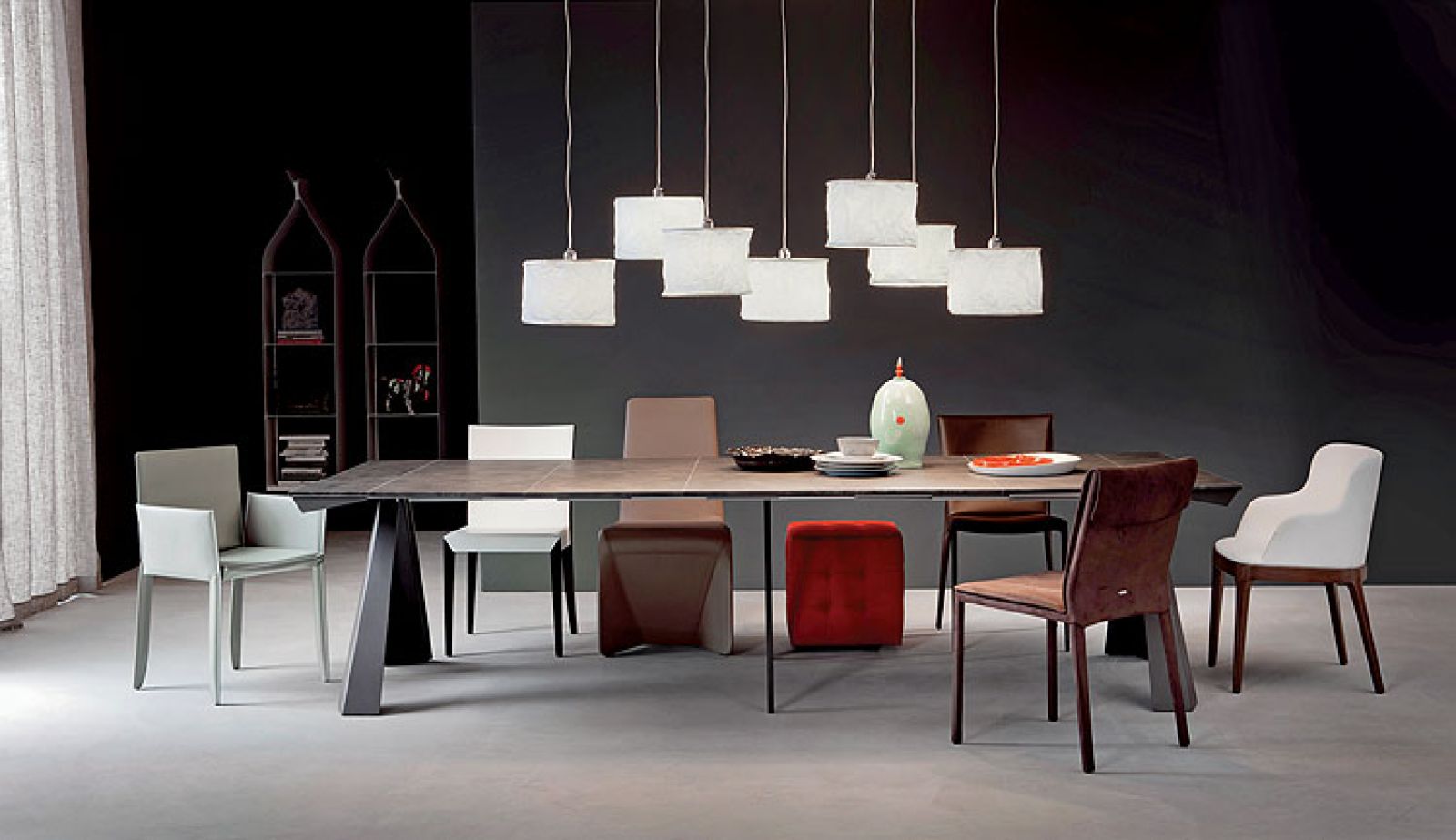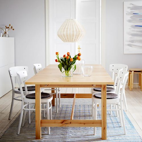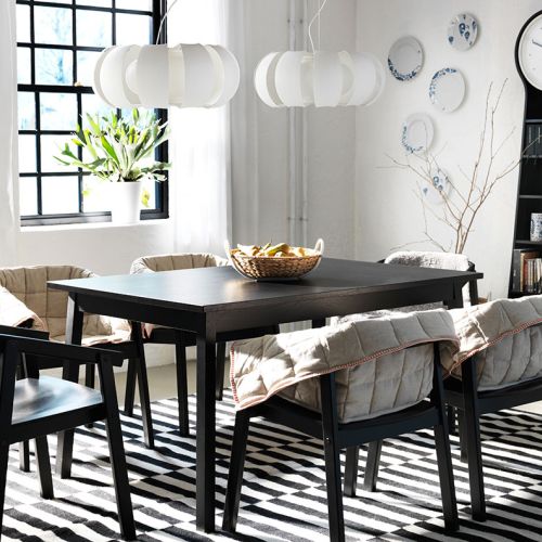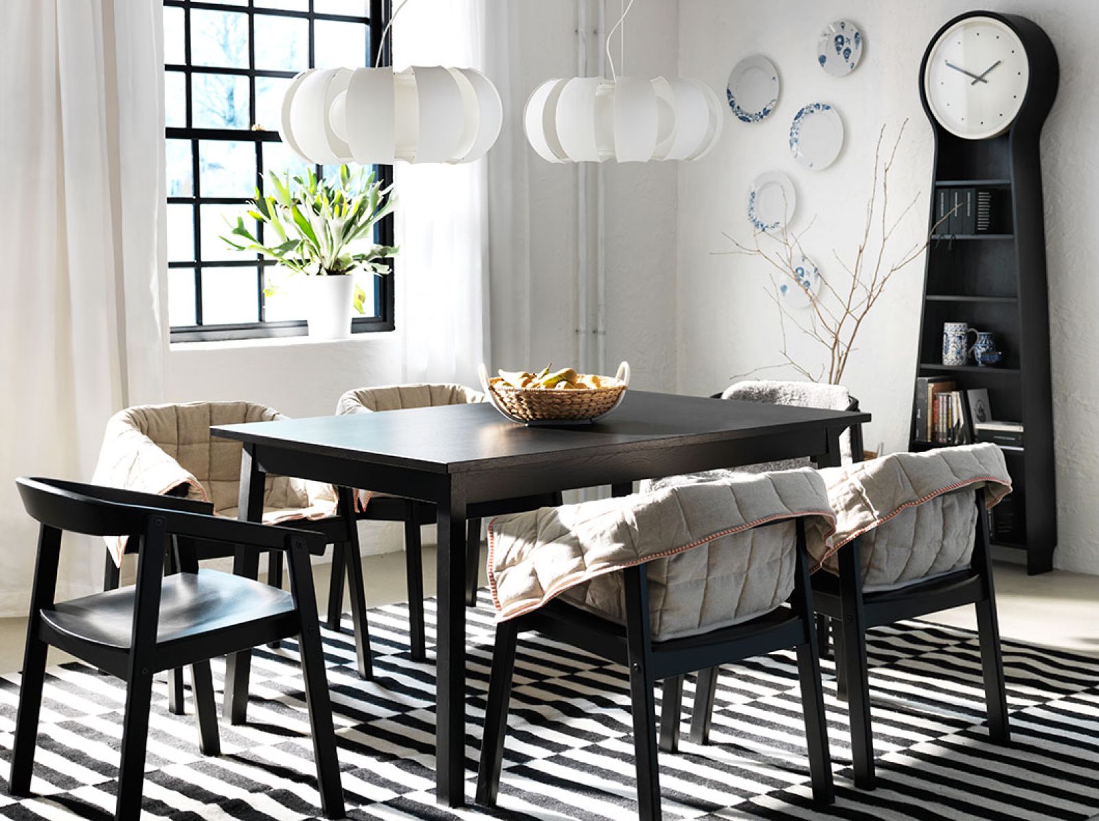 Praktycznym rozwiązaniem do nieco mniejszych jadalni będzie oczywiście stół rozkładany z krzesłami, choć i on, by zmieścić się po rozłożeniu, potrzebuje przynajmniej 12-13 metrów kwadratowych (stół na 8-10 osób) i przynajmniej pół metra odleglości od ścian (tak, by można było swobodnie odsuwać krzesło).