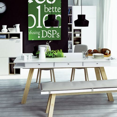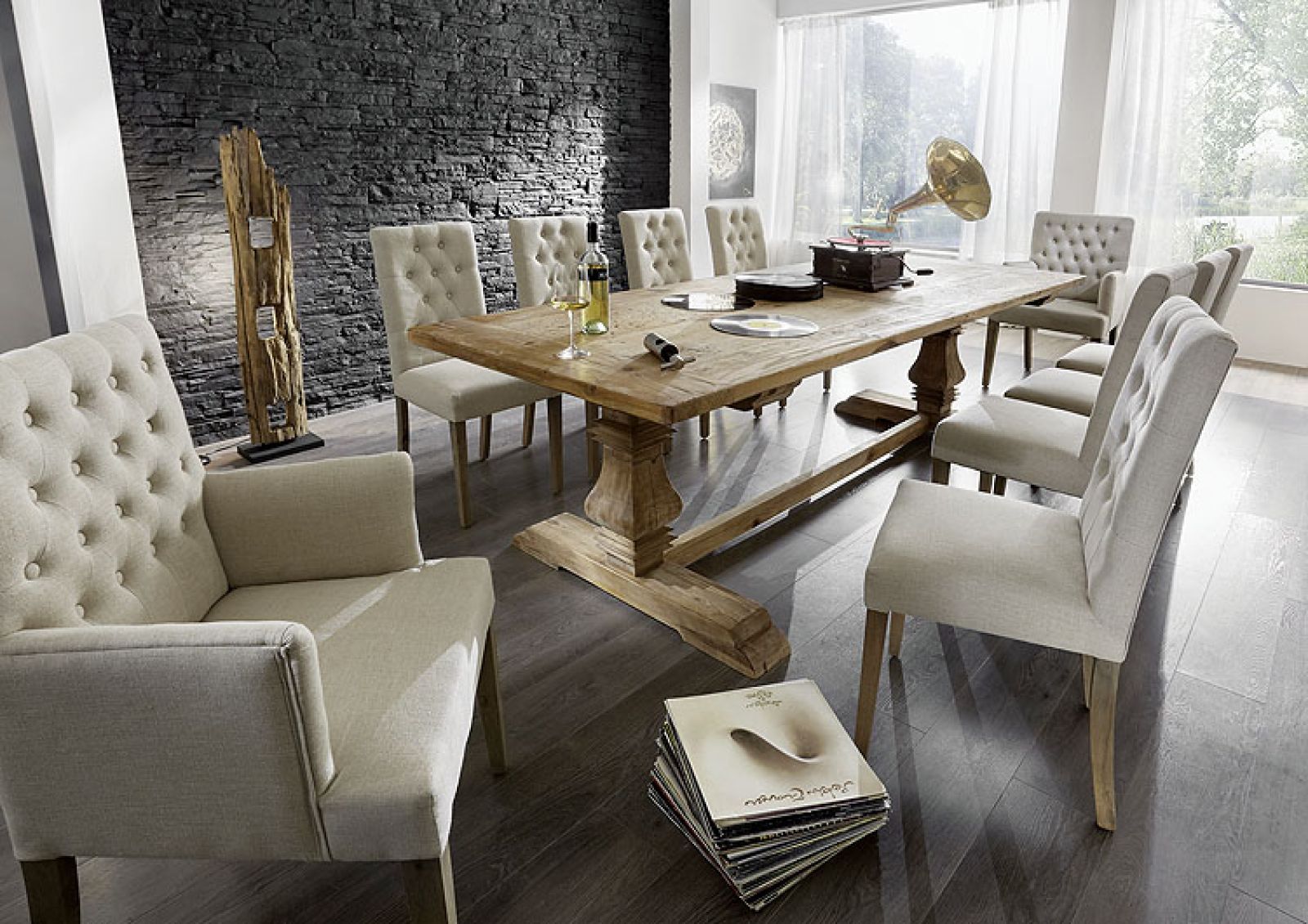 Odpowiedź aż ciśnie się sama: duży stół! Nie każdy może sobie jednak na taki pozwolić, bo wielkość stołu w jadalni będzie zależała oczywiście od tego, jaką przestrzenią dysponujemy. Idealnym rozwiązaniem jest jadalnia oddzielna lub połączona z kuchnią lub salonem, o sporej powierzchni.