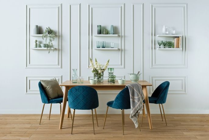 Najbardziej klasyczne i spokojne zestawienie, które sprawdza się w każdym wnętrzu, to jasny dębowy parkiet i jasna ściana. Na takim tle może „się dziać” (sztukaterie, półki, obrazy, grafiki czy nawet kompozycje z kilku luster), a chaosu nie będzie. Kolor ścian to jasny błękit Pixie, farby Beckers Designer Collection.