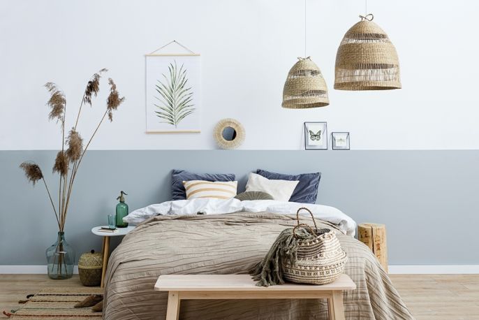 Ściana pomalowana na dwa kolory powiększa optycznie pokój. Wybierz dwa odcienie tego samego koloru, np. modnego błękitu lub szarości. Ciemniejszy kolor na dole tworzy dekorację na wzór lamperii, jaśniejszy, lżejszy, jest na górze.