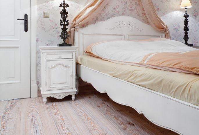 Niemal monochromatyczna sypialnia w bieli, beżu i bladym różu z jasną podłogą. Poczujemy się jak tutaj jak z wizytą u angielskiej damy. Delikatna tapeta w kwiaty pasuje do jasnych desek z jesionu patynowanego. To połączenie daje wrażenie lekkości. Deski podłogowe Marchewka nadają się też na ogrzewanie podłogowe.