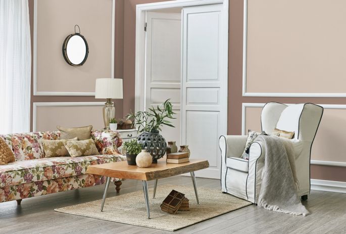 Do podłogi w kolorze ciepłej szarości dopasowano łagodne odcienie beżu i brązu na ścianach – dają harmonijny efekt. Na ścianach farby: Vanilla Muffin i Frappe. Intensywność kolorów ścian podbijają listwy sztukateryjne i drzwi pomalowane białą emalią Beckers Designer Universal.