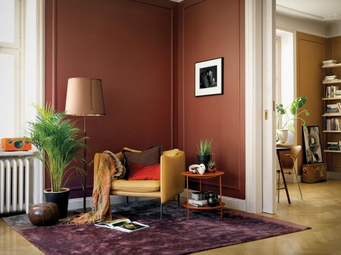 Ciepłe i nasycone kolory ścian sprawdzą się w połączeniu z jaśniejszą drewnianą podłogą. Białe wykończenia stolarki dodają temu zestawowi elegancji. Na ścianie farba Beckers Designer Collection, kolor Cherry.