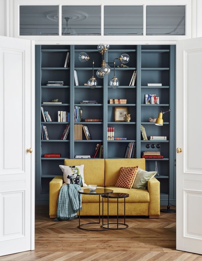 Podłoga dębowa w zestawieniu z zabudową w kolorze złamanego błękitu wydaje się cieplejsza i bardziej nasycona. To wrażenie wzmacnia jeszcze kontrastująca z tłem żółta kanapa. Na podłodze klepki dębowe Chapel Parket w kolorze Canyon. Podłogi Chapel Parket są robione tylko na zamówienie i wyłącznie z najwyższej jakości europejskiego drewna dębowego.