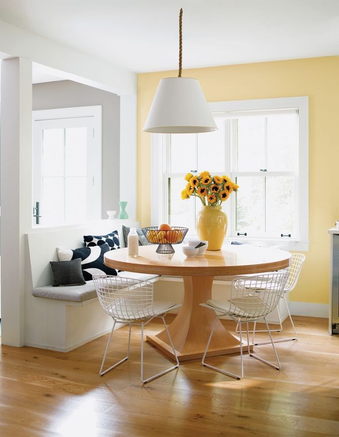 Możesz połączyć ciepłe odcienie ścian i podłóg. Na przykład żółta ściana dobrze wygląda z jasnym parkietem. Takie połączenie sprawi, że wnętrze będzie słoneczne nawet w pochmurny dzień. Na zdjęciu poniżej farba Natura Interior Waterborne Paint Flat Finish 512 marki Benjamin Moore, antyalergiczna.