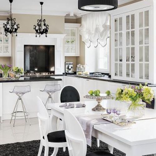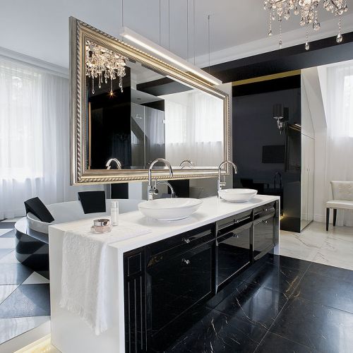 W salonach w stylu glamour najczęściej pojawiają się kryształowe żyrandole, na konsolach stoją elegancko oprawione fotografie, a w wazonach piękne kwiaty. W łazienkach w stylu glamour połyskują czarno-białe płytki albo elegancka, bogata mozaika.