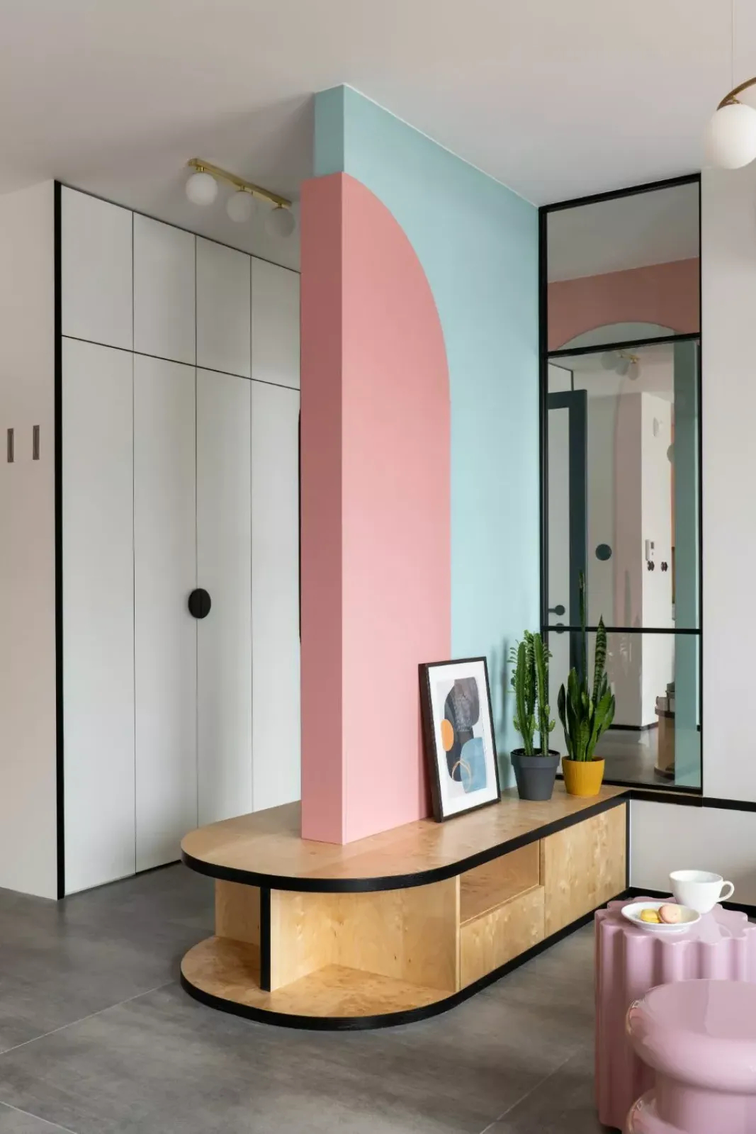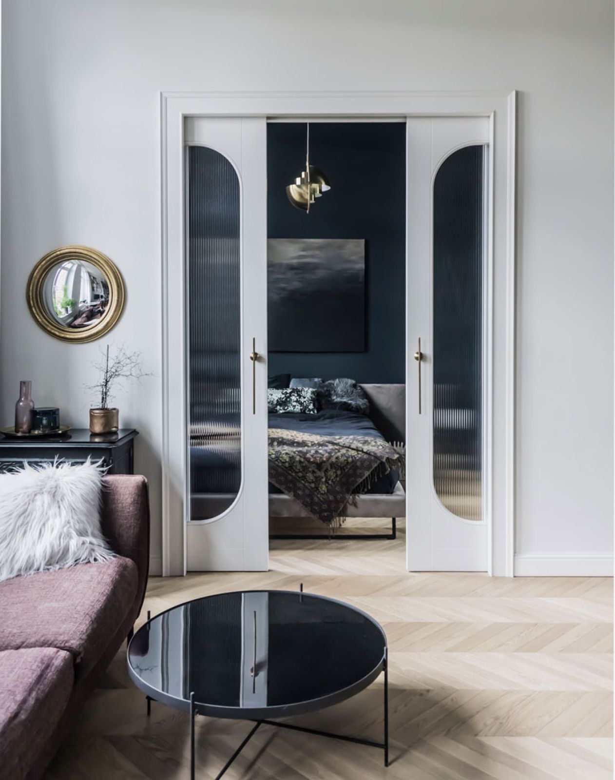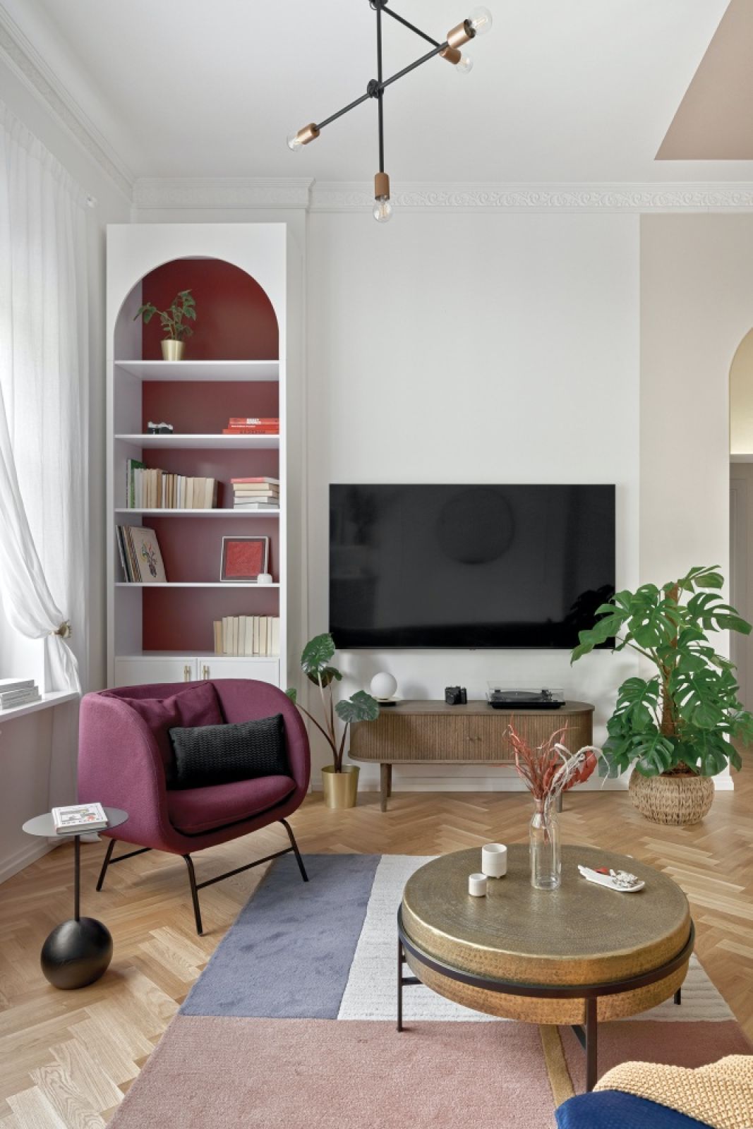 Kolor stolarki nie musi być agresywny, ale żywy – warto dobrać go do otoczenia – tonacji na tapecie, czy deseni na dywanie. Kiedy będzie widoczny, uwagę zwróci też kształt otworu w ścianie, drzwi, wgłębień… Zaokrąglone nisze też możesz zaakcentować kolorem (ciemniejszy stworzy iluzję głębi) i wyeksponować w nich piękną rzeźbę albo postawić ozdobną lampkę.