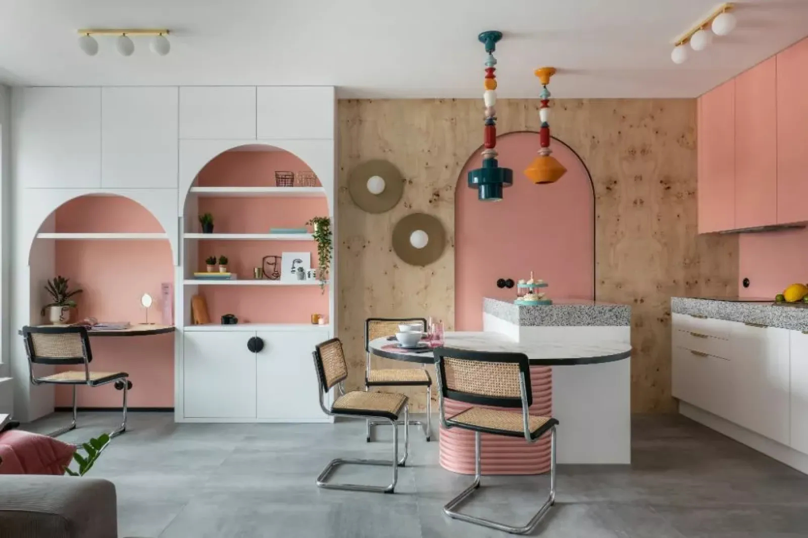 Co powiesz na taką jadalnię? Dużo tu się dzieje, ale wszystko jest przemyślane. To prawdziwa kraina łagodności. Łuków i obłości jest tutaj naprawdę sporo, ale pomimo, że dominują, nie są nachalne.