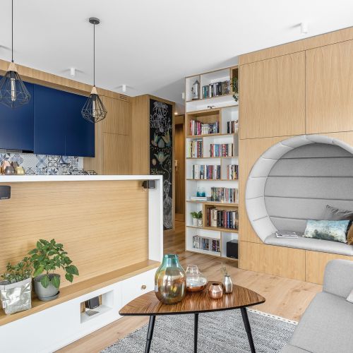 Ściana pełna książek wygląda bardzo efektownie, możesz ustawić je na regałach, półkach albo zrobić bibliotekę z kubików, które dodasz, gdy przybędzie nam lektur. Na książki warto wykorzystać każdy centymetr przestrzeni w małym mieszkaniu – ciekawie wyglądają biblioteczne półki wokół drzwi, nad oknem albo pod parapetem, jeśli akurat nie ma tam kaloryfera.