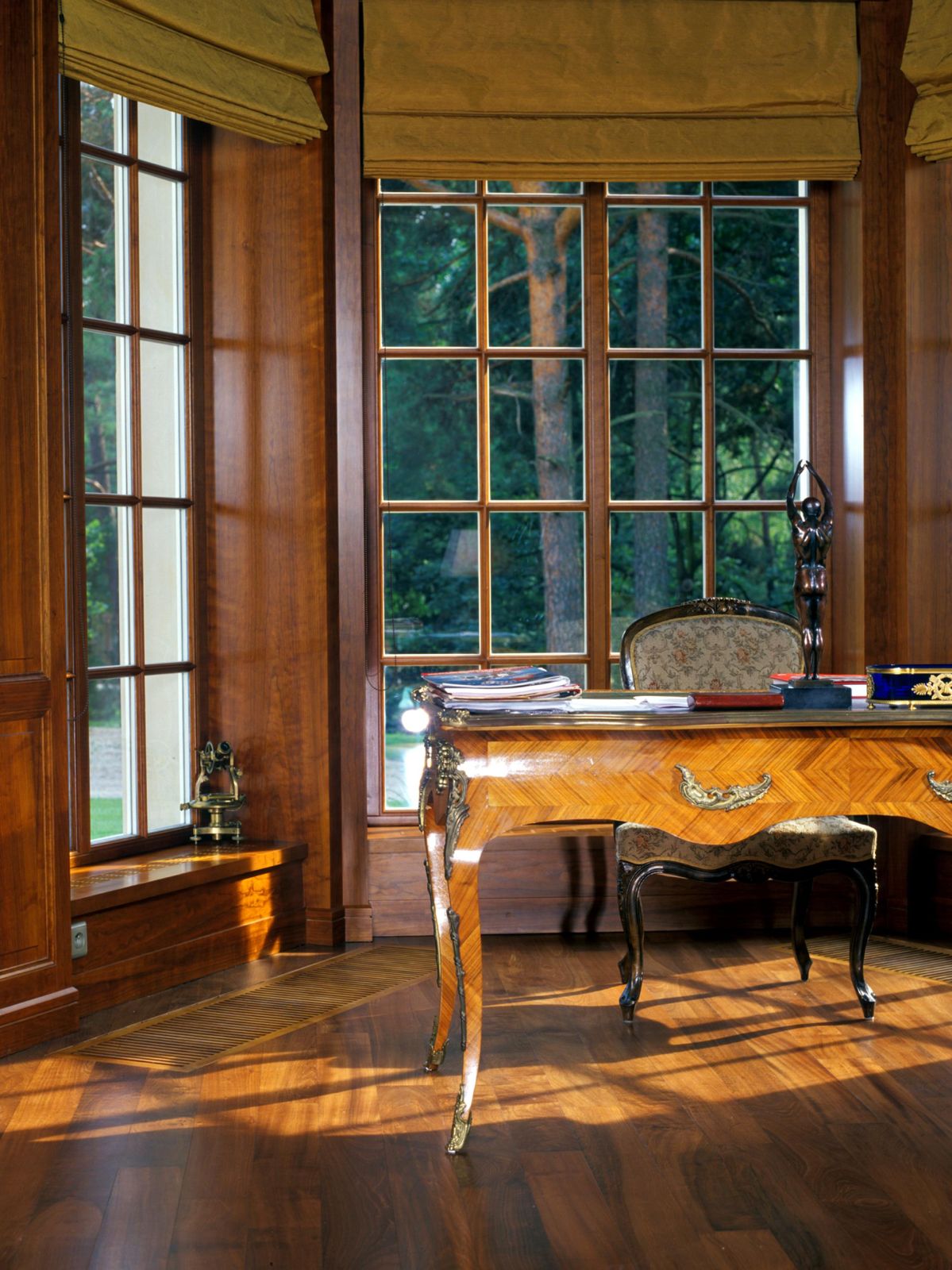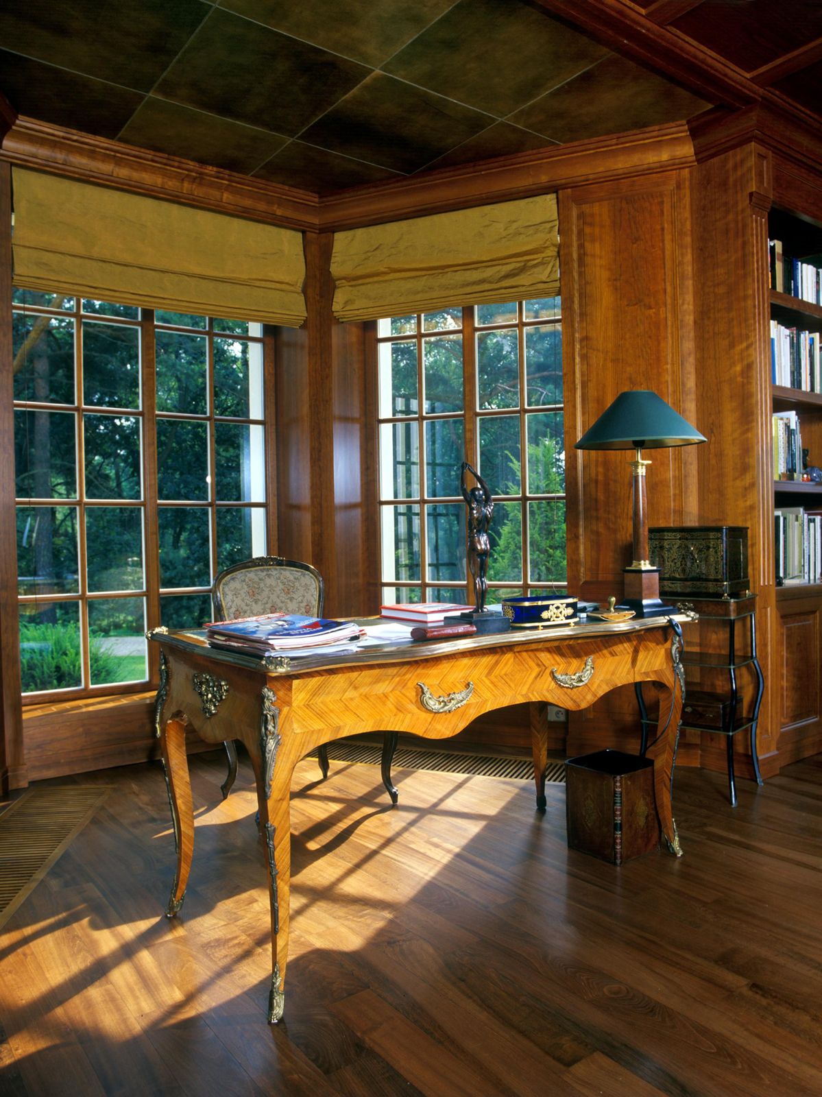Pierwszoplanową rolę odgrywają niewątpliwie biurko oraz fotel, które najlepiej usytuować vis a vis wejścia do pokoju. Biurko powinno posiadać miejsce do przechowywania dokumentów, aby uniknąć wrażenia nieładu na jego blacie. Praktyczną dekoracją biurka mogą być elegancki przycisk do dokumentów, kałamarz czy nożyk do otwierania listów.