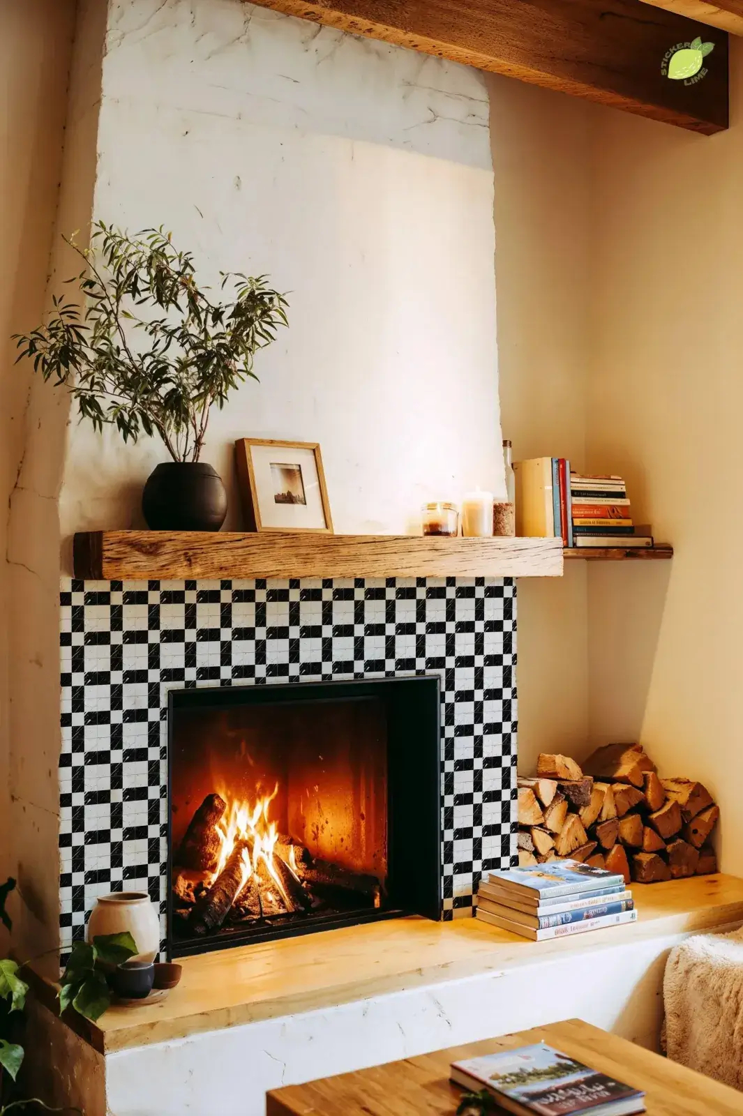 Jak stosować wzór w kratkę we wnętrzach – jako dekorację wokół kominka