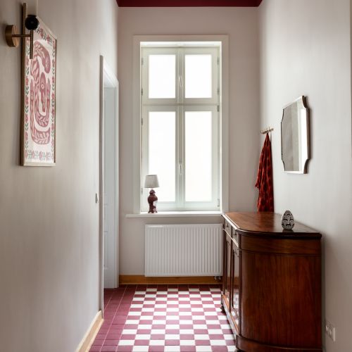 Nierówne, ręcznie robione płytki mają retro charakter, który doskonale współgra ze starymi, drewnianymi dechami na podłodze i orientalnym dywanem. Całość idealnie pasuje do tradycyjnych mebli oraz vintage’owych obrazków na ścianie. Tu nic się nie gryzie – przeciwnie, wszystko ze sobą współgra, tworząc zjawiskową aranżację. Prosty zabieg, a tak skutecznie urozmaica przestrzeń.