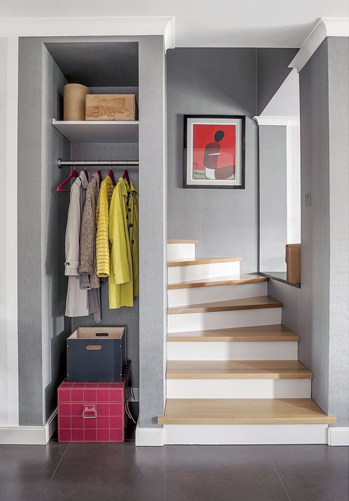 Jeśli Twój przedpokój jest naprawdę malutki, unikaj ciemnych barw – ciemne kolory ścian sprawią, że wnętrze jeszcze bardziej się zacieśni. Postaw na jasne, neutralne odcienie: ciepłe beże, szarości, delikatne pastele. Rozjaśnią pomieszczenie i sprawią, że optycznie wyda się większe. Jeśli masz niskie mieszkanie, pomaluj sufit na biało, a korytarz wyda się wyższy. Cudownie jeśli masz przedpokój z oknem – dzienne światło powoduje, że przestrzeń nabiera lekkości i oddechu. Pamiętaj, że jeśli przedpokój jest otwarty na resztę mieszkania, kolory ścian nie powinny ze sobą zbytnio rywalizować. Dobrze jeśli będą pomalowane na podobny odcień.