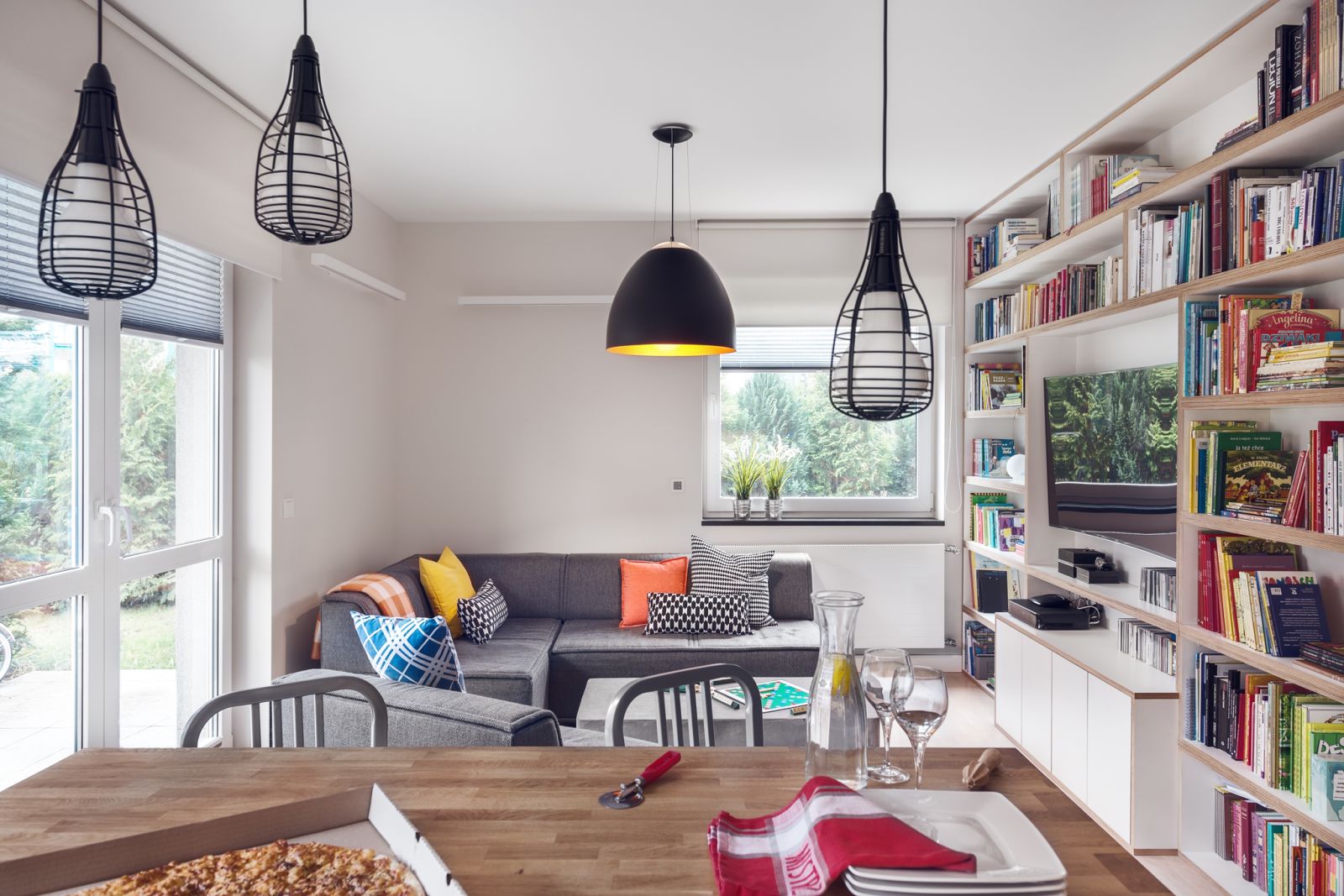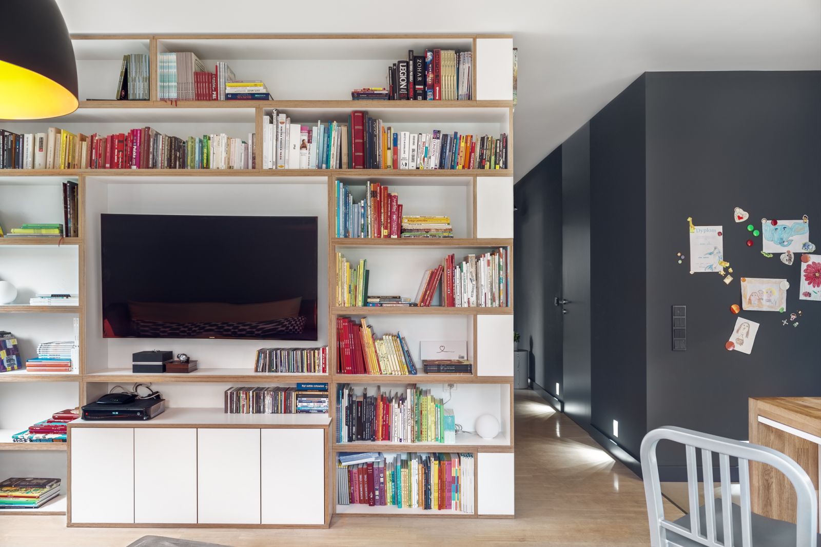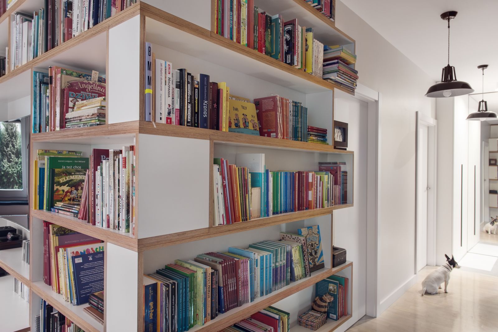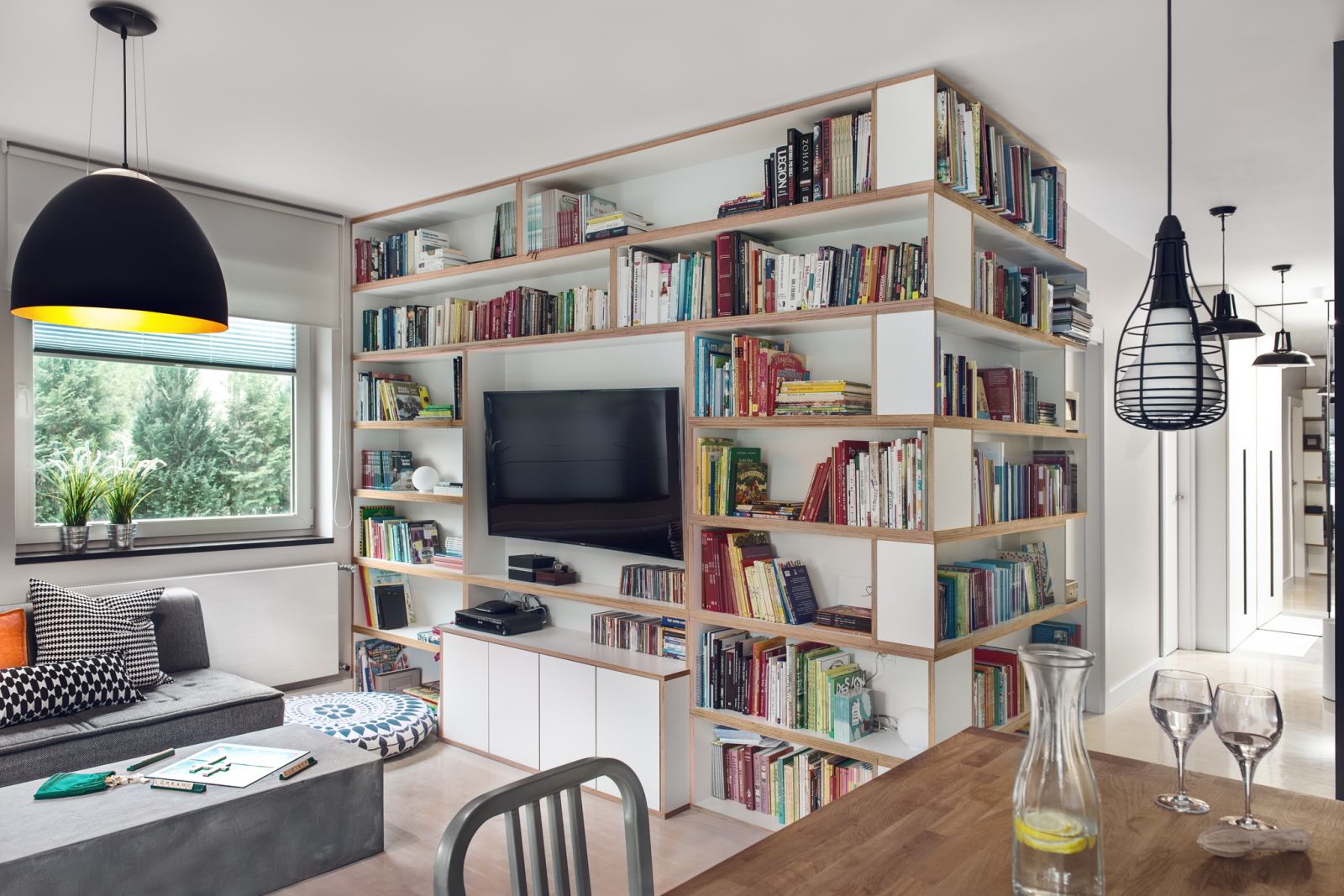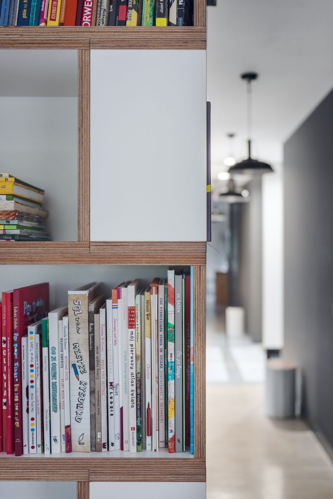 Główną część mieszkania tworzy otwarta przestrzeń składająca się z kuchni i części wypoczynkowej. Pani domu to miłośniczka książek - związana jest z nimi zarówno duchowo, jak i zawodowo. I to właśnie jej pasja do lektury natchnęła projektantów, by "sercem" domu był olbrzmi, wysoki, umiejscowiony w centralnym punkcie mieszkania regał wypełniony książkami.