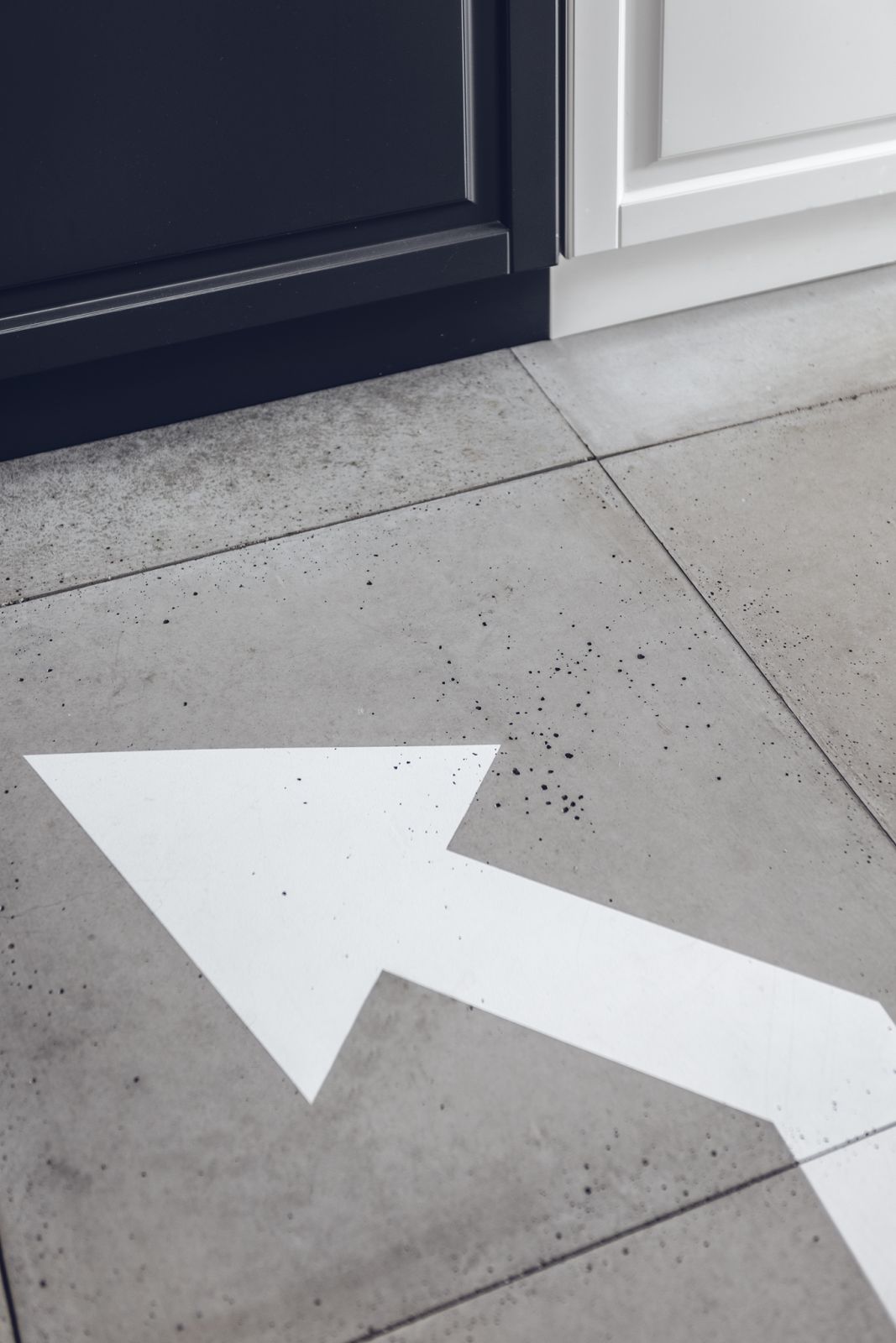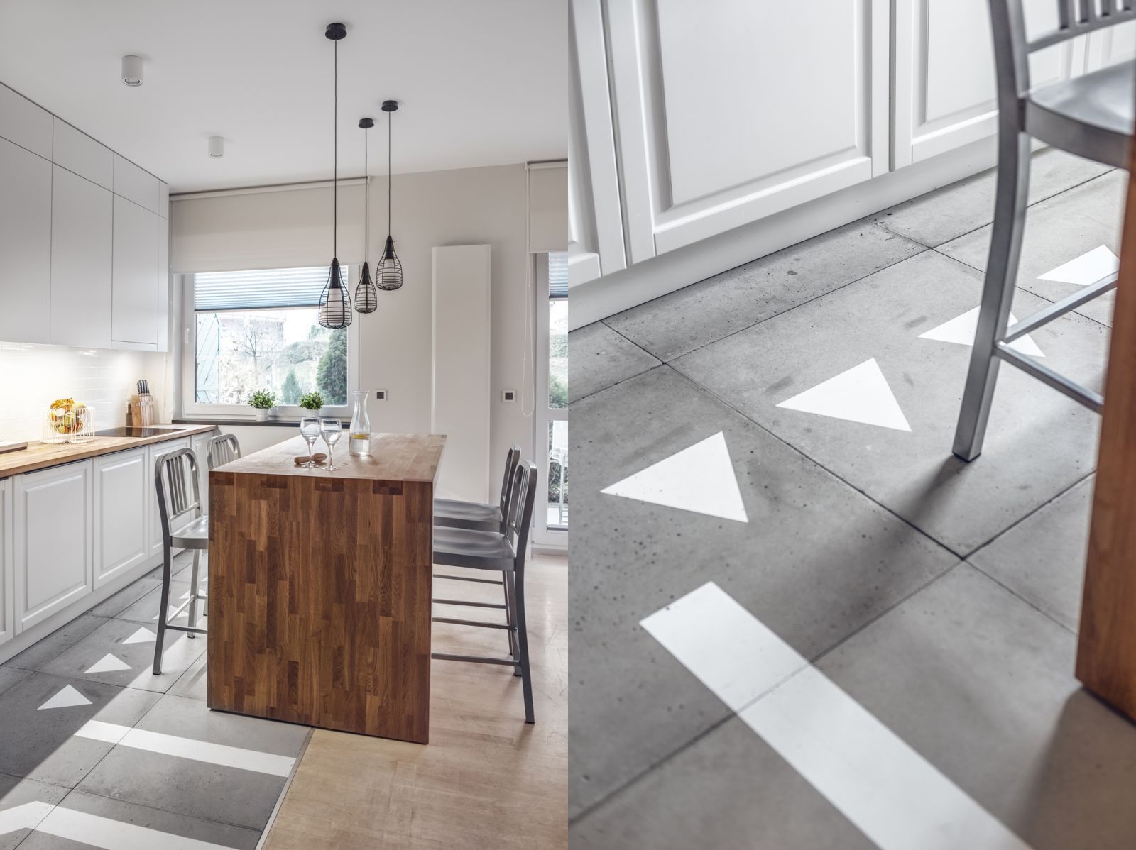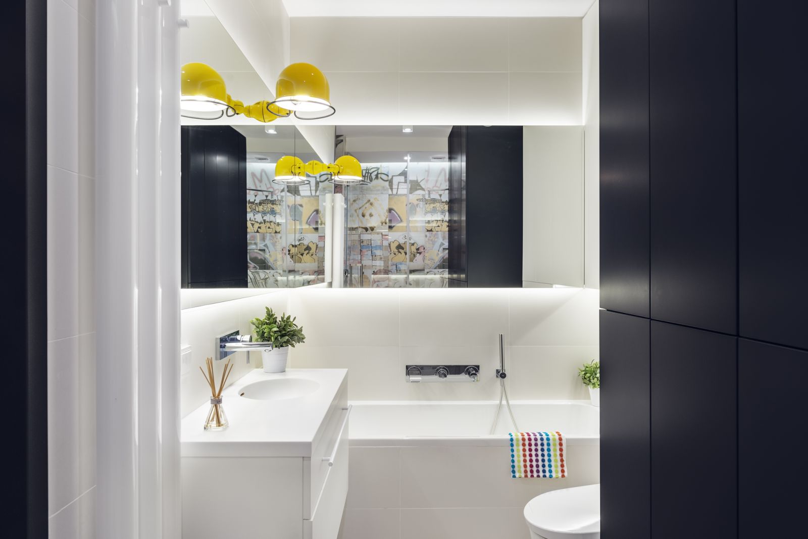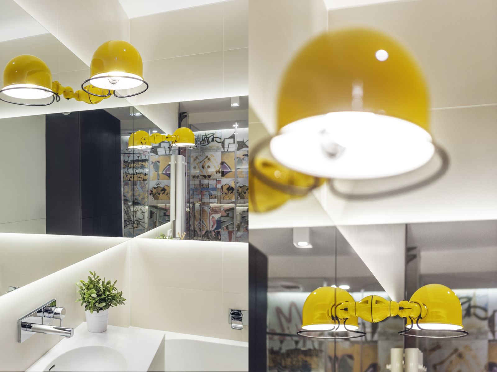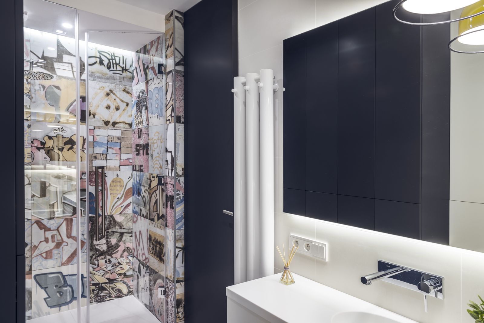 Ciekawym elementem dekoracyjnym są też tutaj graficzne motywy znaków poziomych, namalowanych na kuchennej betonowej posadzce. Inspiracją do jej stworzenia było z kolei zamiłowanie właściciela do ulicznych artystów, takich jak m.in. Banksy. Dekoratorzy poszli dalej tym tropem i w stylu Street Art zaprojektowali także łazienkę, w której dominują czarne meble, białe kafle oraz wyróżniające się płytki z kolorowym graffiti - ciekawie ułożone pod prysznicem. Dopełnieniem tego klimatu jest rzucający się w oczy żółty kinkiet.