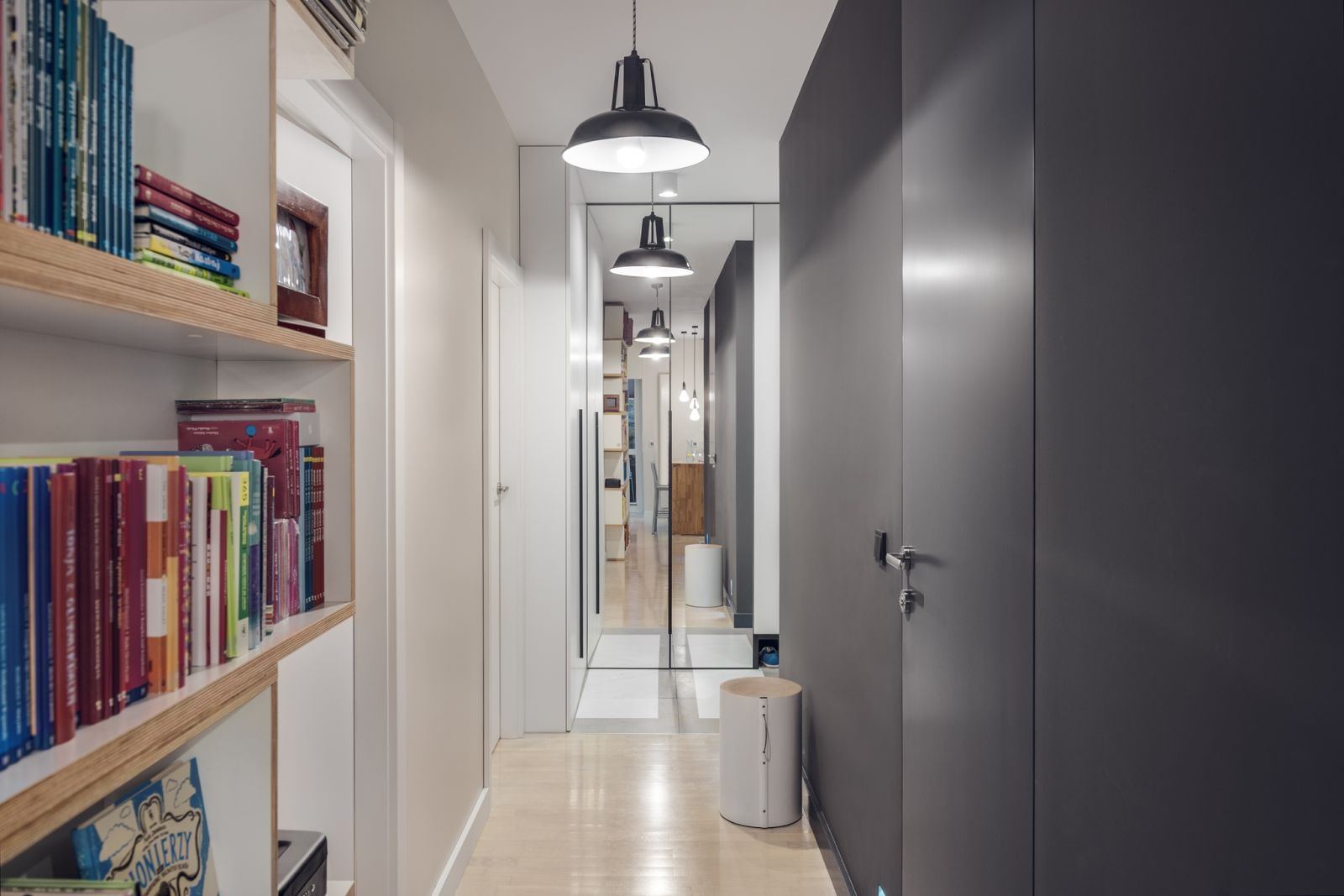 Łącznikiem w mieszkaniu jest korytarz z przedsionkiem wejściowym, w którym znajdują się szafy na ubrania. Zastosowanie lustra na jednej z nich sprawia, że komunikacja wnętrza mieszkalnego wygląda jak fragment ulicy z przejściem dla pieszych oraz rozdrożem, optycznie także poszerza mieszkanie. Z korytarza wchodzi się do wszystkich pozostałych pomieszczeń, sypialni z drewnianą zabudową i łóżkiem składanym w szafę, oraz pokoju córki, w którym dominuje motyw żeglarski.