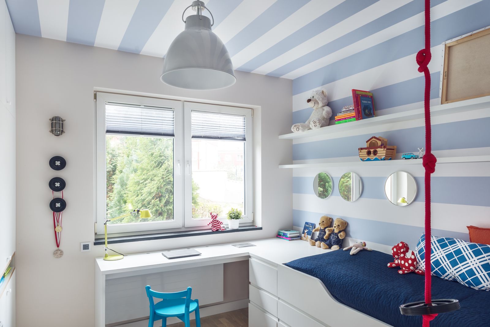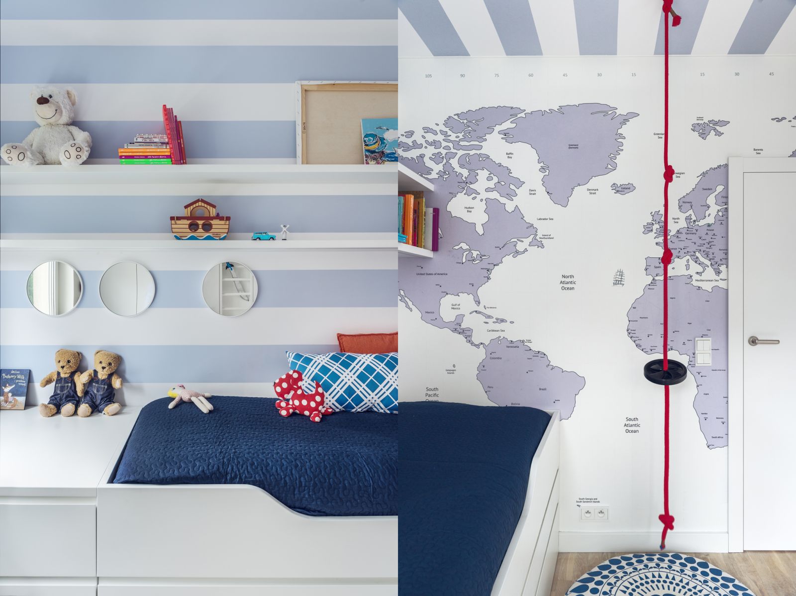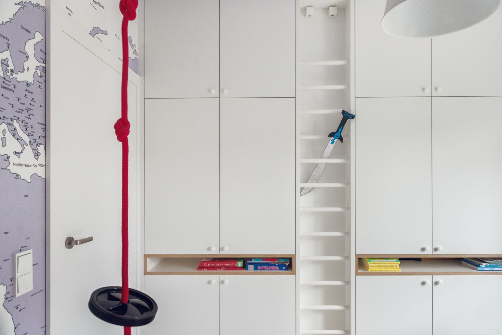 O najmłodszej domowniczce także nie zapomniano. Jej ciekawość świata odzwierciedla olbrzymia mapa umieszczona na ścianie. Bardzo sprytnym rozwiązaniem jest tu łóżko, które po rozłożeniu daje możliwość przenocowania dodatkowej osoby.
