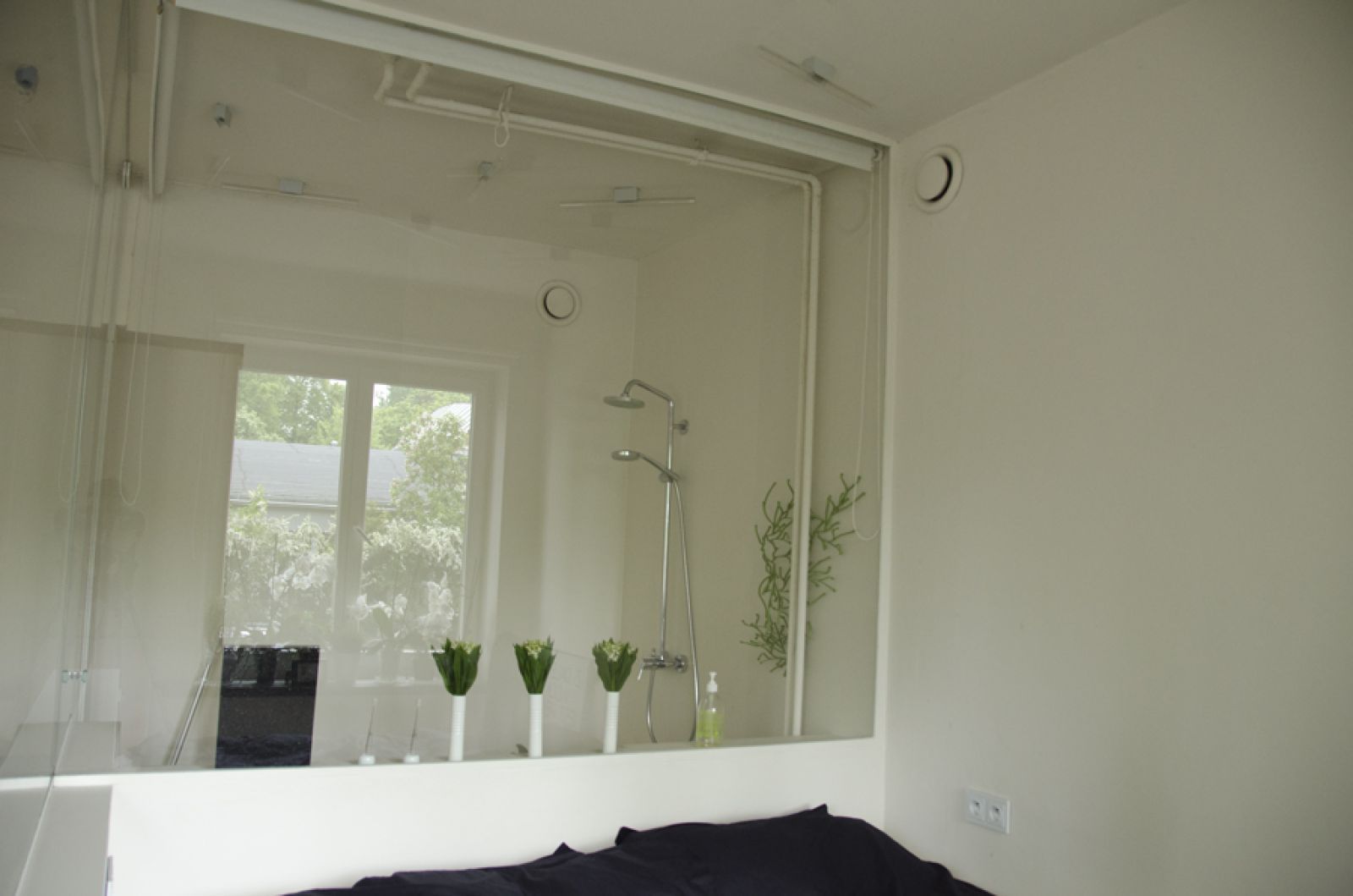 To dość śmiały pomysł, biorąc pod uwagę, że łazienka jest… kabiną prysznicową, którą od reszty mieszkania oddzielają tylko tradycyjnie szklane ścianki. Oprócz prysznica, zmieściły się tu także umywalka i sedes. Aby zachować intymność i móc korzystać z toalety, gdy w mieszkaniu są np. goście, wystarczy opuścić zamontowane na ściankach rolety.