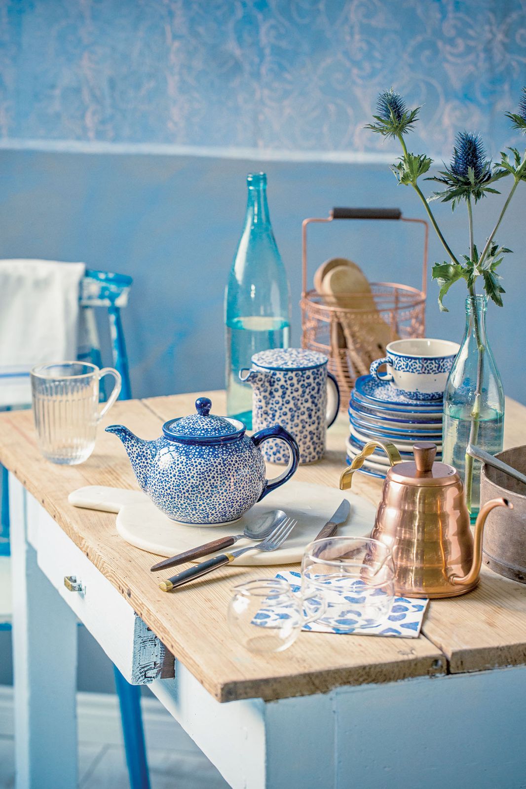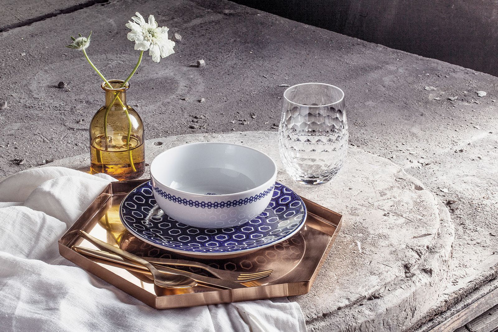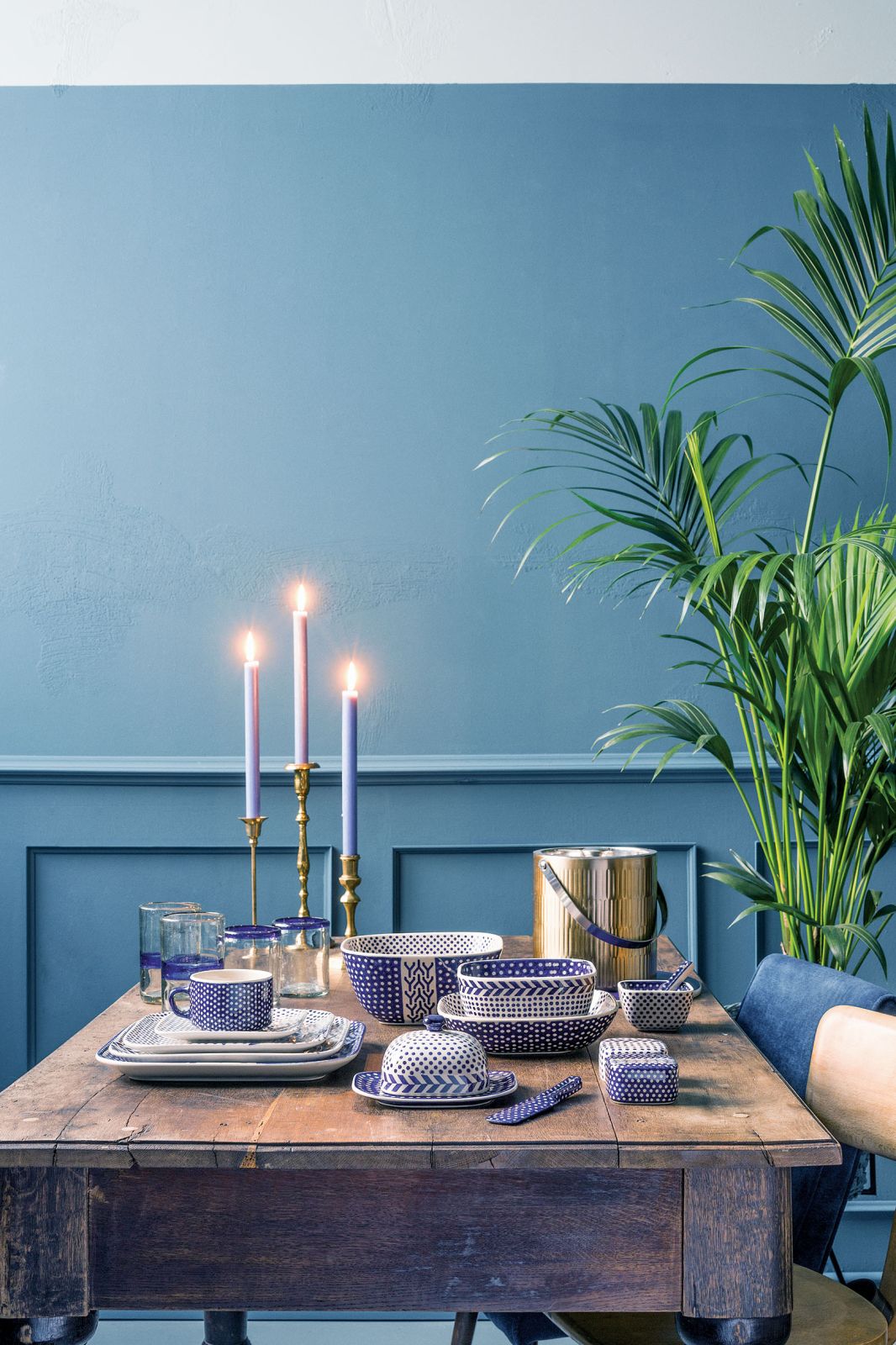 BLUE LINE, którą można kupić od marca, jest podzielona na trzy linie. Tradition to proste stempelkowe wzory, znane pawie oczka, kropki, listki. Wedding jest bardziej romantyczna: roślinne wici, kwiatki, ażury, bordiury talerzy, białe wzory (!) na kremowej kamionce. Wreszcie graficzna Modern, projekt Magdy Gazur, czyli kratki i zygzaki. Jej szlaczki przypominają ludowe krajki albo alfabet Morse’a. Naczynia można dowolnie łączyć, bo wszystkie mają kobaltowe wzory. Dzięki miedzianym dodatkom oraz kryształom z Huty Julia stworzymy stół jak artystyczny kolaż.