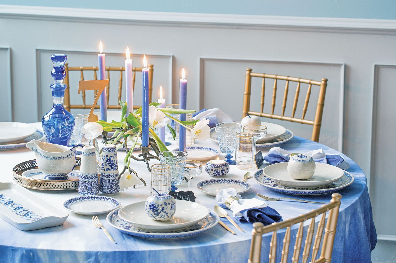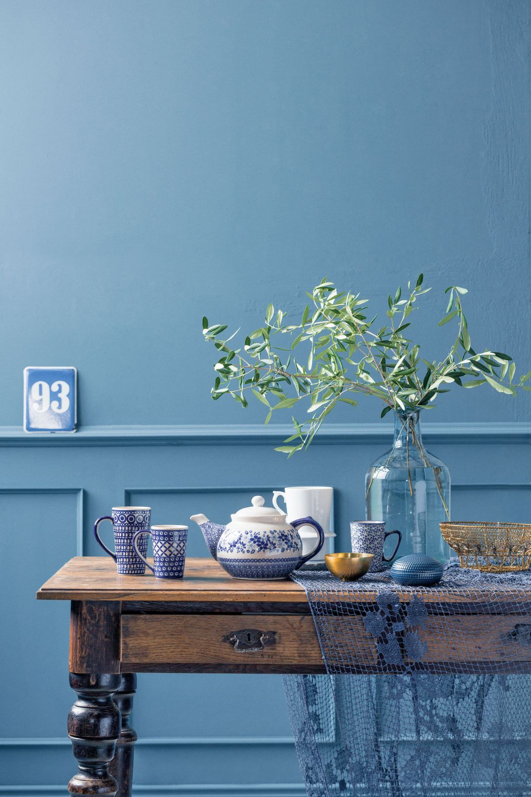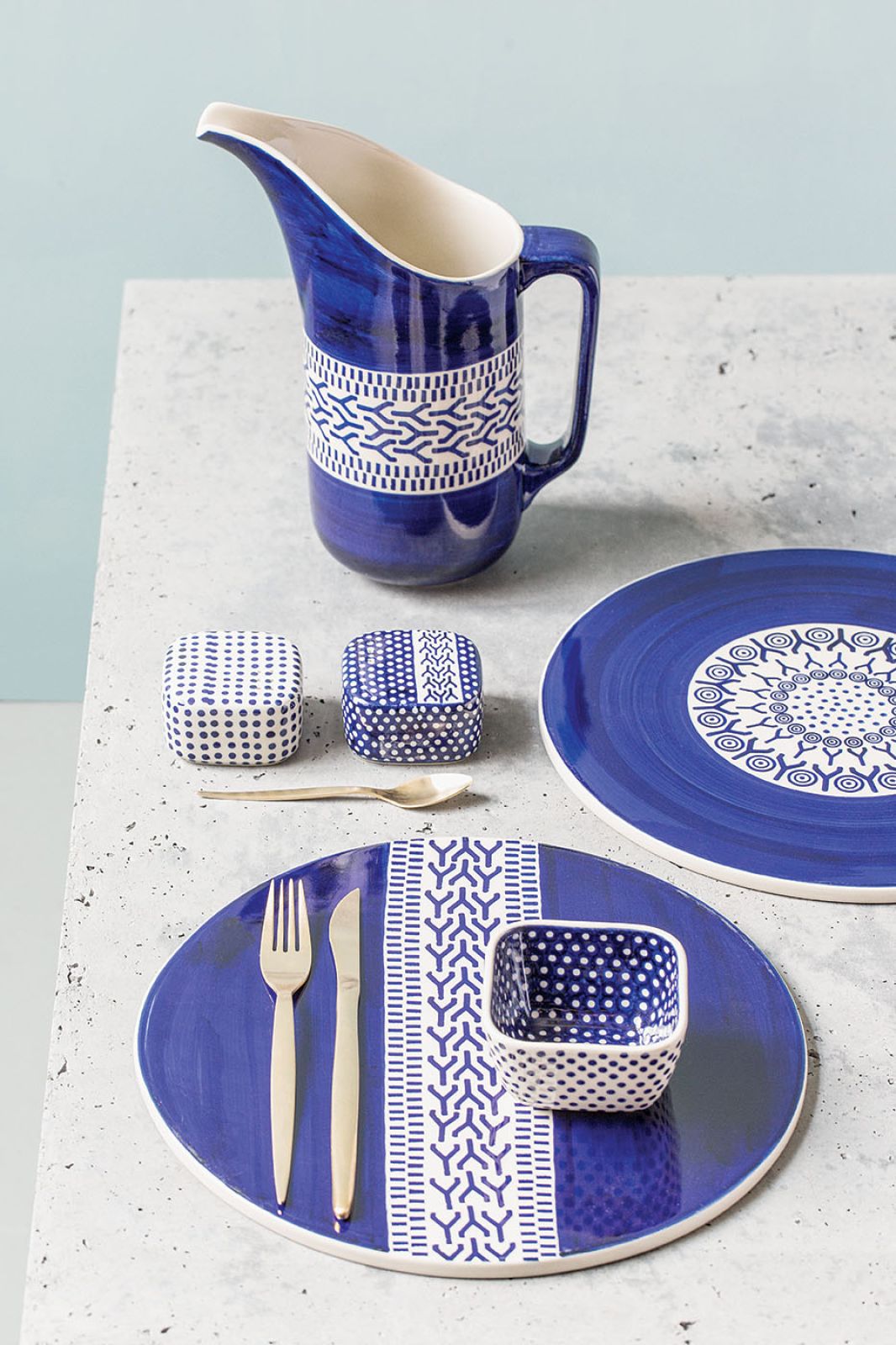 BLUE LINE, którą można kupić od marca, jest podzielona na trzy linie. Tradition to proste stempelkowe wzory, znane pawie oczka, kropki, listki. Wedding jest bardziej romantyczna: roślinne wici, kwiatki, ażury, bordiury talerzy, białe wzory (!) na kremowej kamionce. Wreszcie graficzna Modern, projekt Magdy Gazur, czyli kratki i zygzaki. Jej szlaczki przypominają ludowe krajki albo alfabet Morse’a. Naczynia można dowolnie łączyć, bo wszystkie mają kobaltowe wzory. Dzięki miedzianym dodatkom oraz kryształom z Huty Julia stworzymy stół jak artystyczny kolaż.