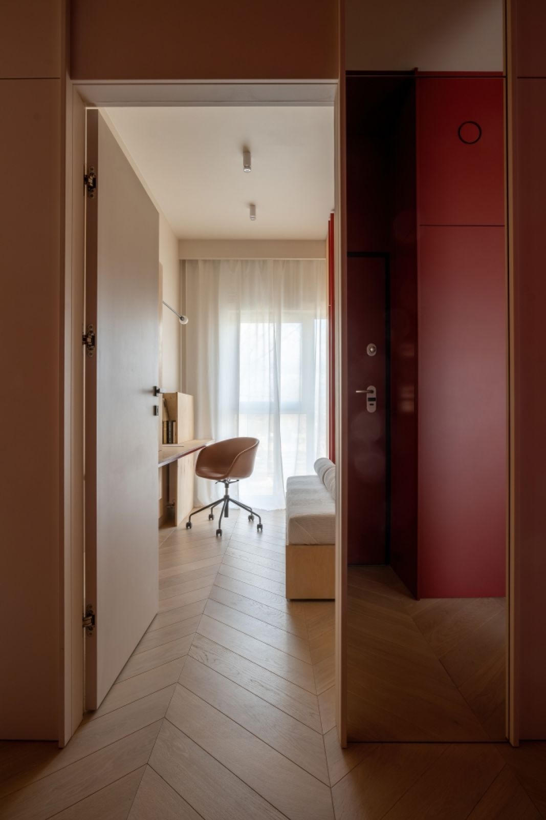 Oświetlenie: listwy LED w szafie do przedpokoju oraz na suficie, aby dodać przestrzeni lekkości.