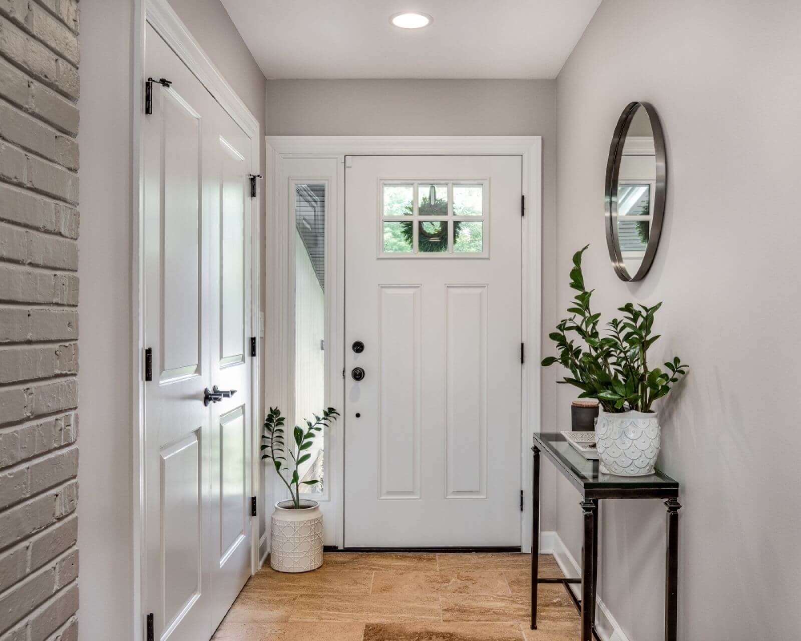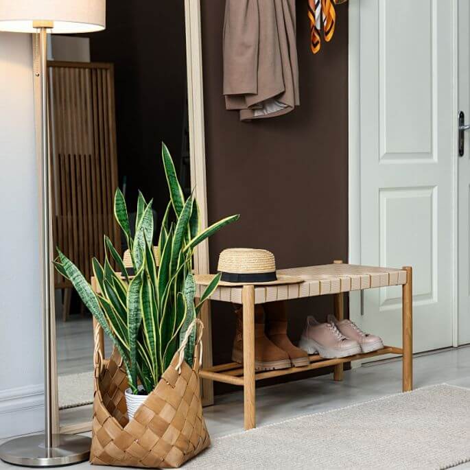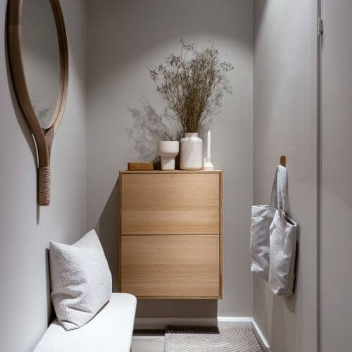 Meble: doskonały pomysł to wąska konsola z szufladami na drobiazgi lub siedzisko z ukrytym schowkiem na obuwie. Mimimalistyczne szafy wnękowe też będą pasowały. Poza tym pomyśl o stojącym prostym wieszaku lub minimalistycznym panelu z wieszakami na kurtki i klucze.