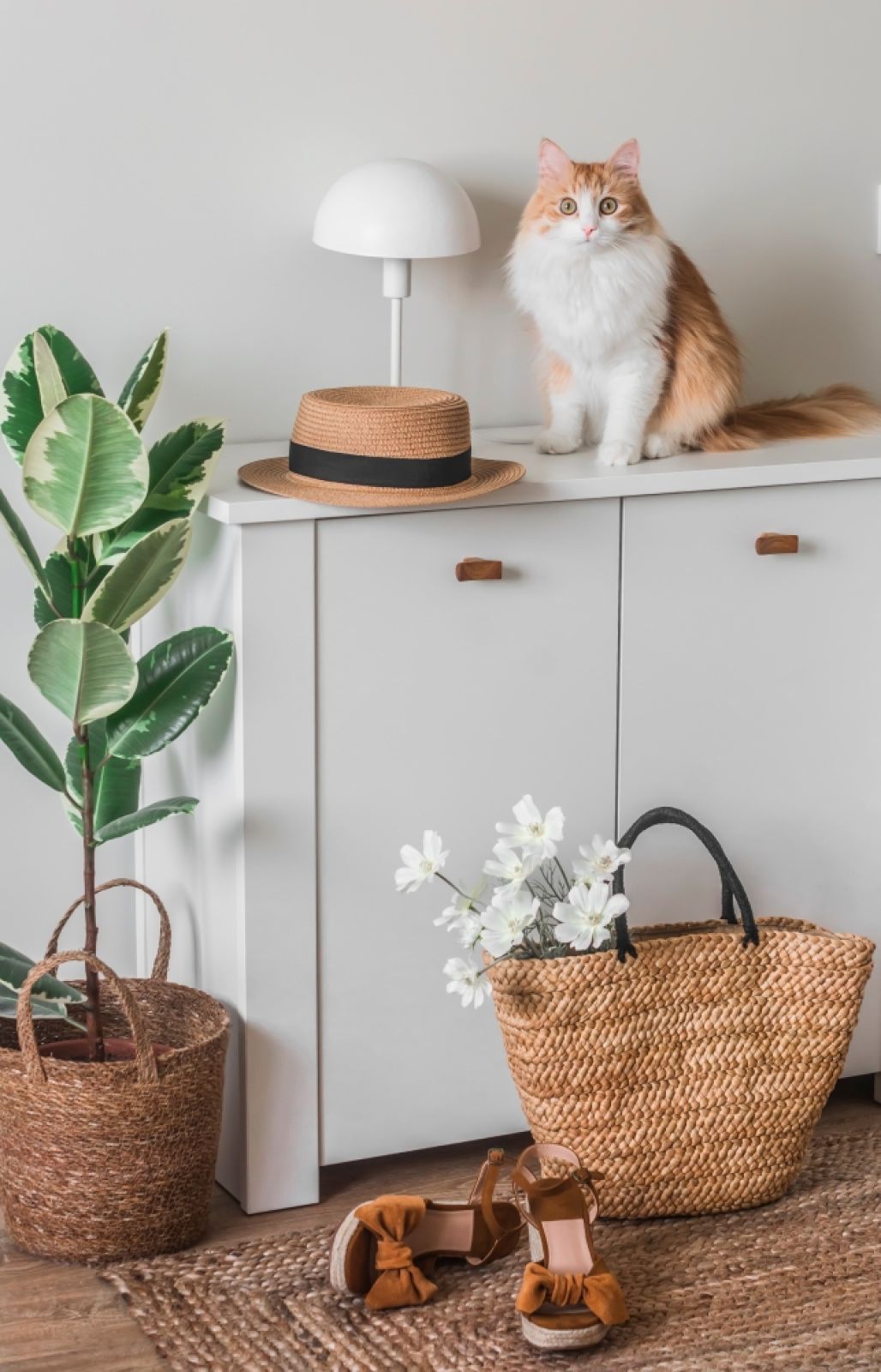 Dodatki: miękki dywanik w neutralnym kolorze albo dywanik z plecionki. Lustro w naturalnej, drewnianej lub prostej, czarnej ramie. Rośliny, np. paprotki lub sukulenty, plecione kosze i inne naturalne dodatki, które dodadzą wnętrzu przytulności.