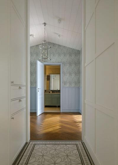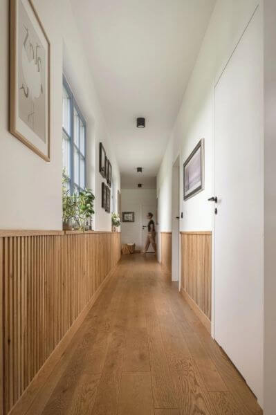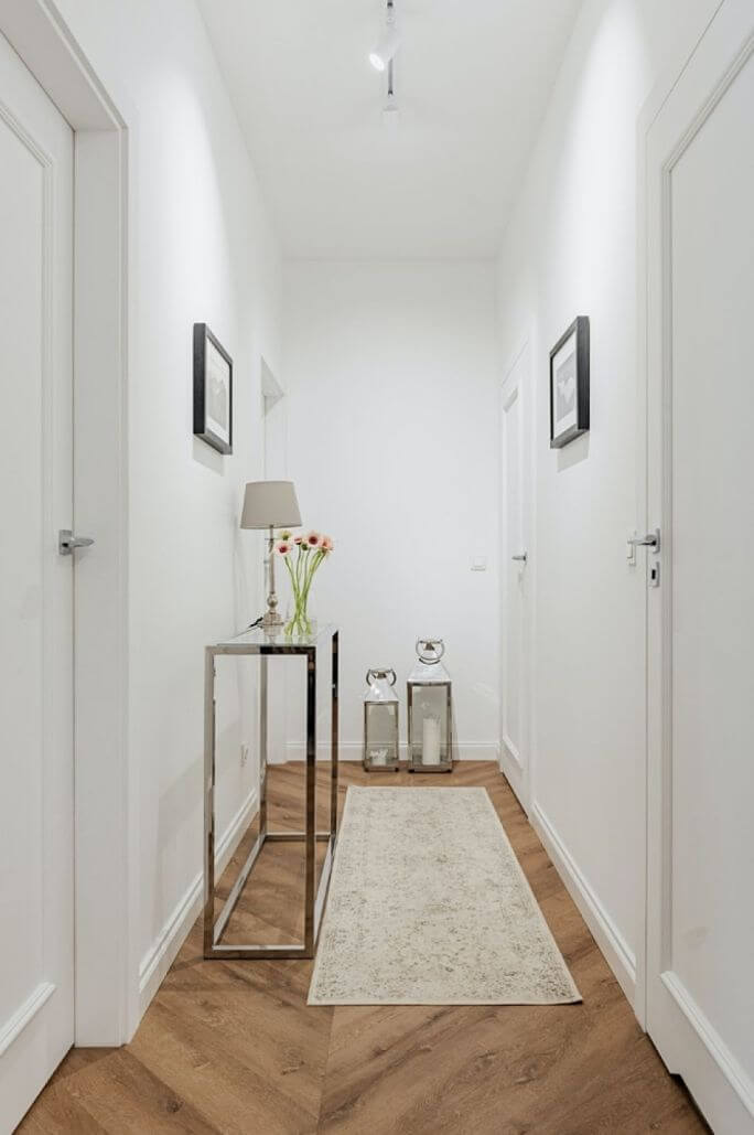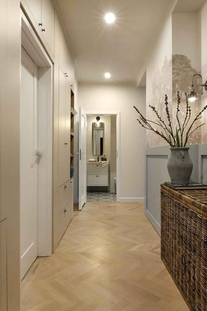 Podłoga: jasne panele, deski lub kafelki z delikatnym wzorem pomogą wydłużyć przestrzeń. Jeśli korytarz jest długi, ułóż deski w poprzek, aby optycznie go skrócić.