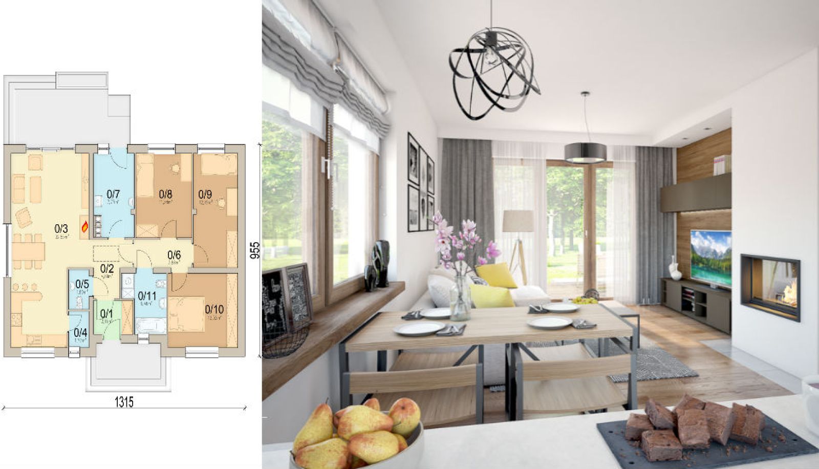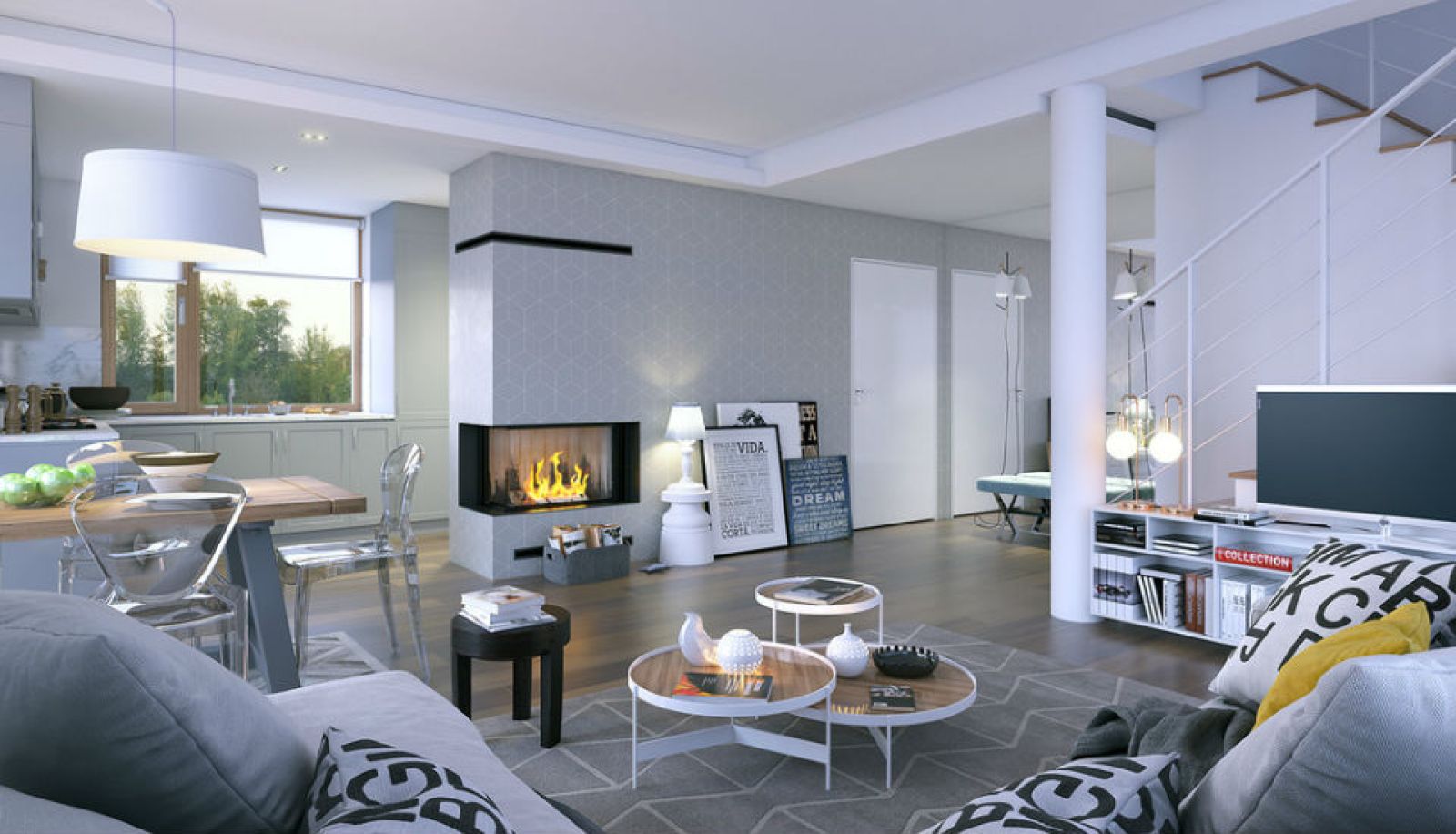 W większości projektów domów strefa dzienna jest otwarta i wyraźnie oddzielona od nocnej. Salon, kuchnia i jadalnia są ze sobą połączone, dzięki czemu zyskuje się dodatkową przestrzeń (którą zajęłyby ściany działowe), a dom staje się optycznie większy. Przedłużeniem salonu jest taras, który subtelnie łączy dom z jego otoczeniem.
