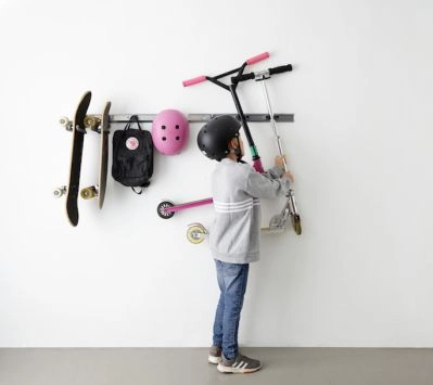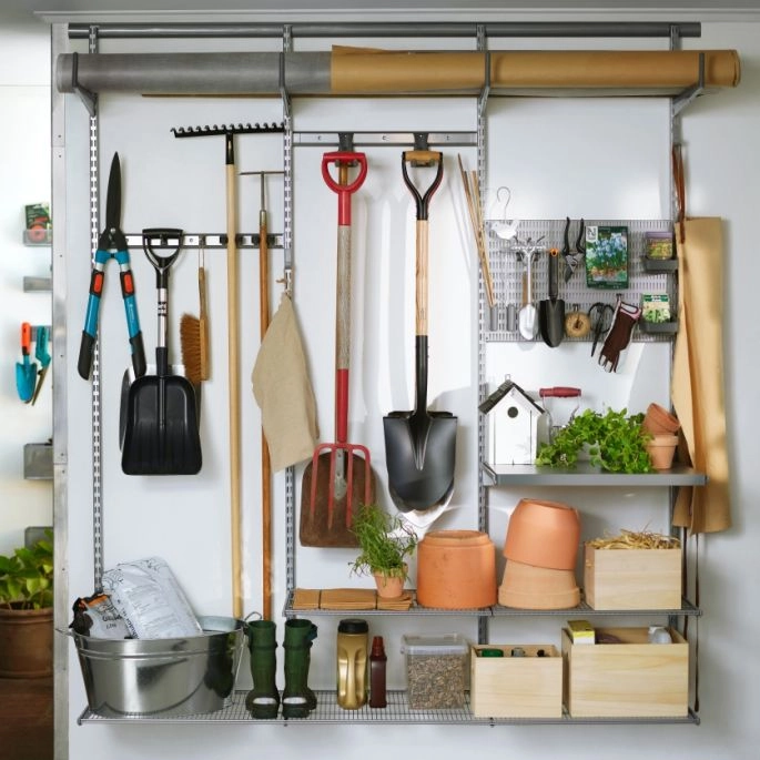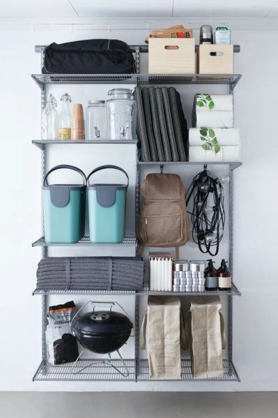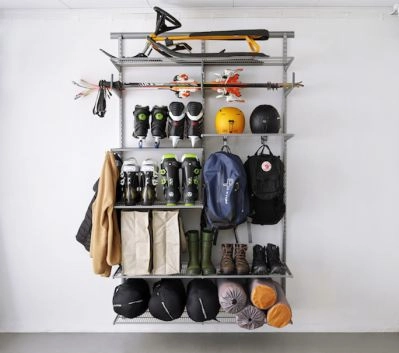 Zawieszony system, na który składają się organizatory, półki, dedykowane haczyki, kosze, uchwyty narzędziowe, itd. Nada pomieszczeniu przejrzystości i pomoże Ci zaplanować przechowanie sezonowo. Gdy nadejdzie lato, narty i inne zimowe przedmioty możesz przenieść do schowka i uzyskać łatwiejszy dostęp do rowerów oraz narzędzi ogrodowych.
