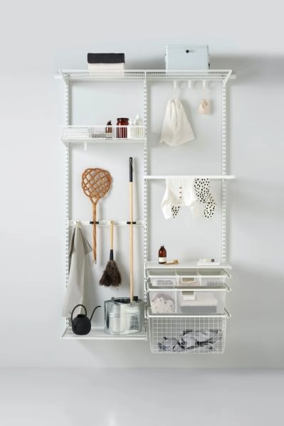 Eksperci Elfa stworzyli system przechowywania w pralni dostosowany także do bardzo niewielkich pomieszczeń – znajduje się na drzwiach. Co ciekawe, nie trzeba wiercić żadnych dziur – system utrzymuje się na specjalnych hakach. Wśród gotowych rozwiązań do pralni znajdziesz np. składany wieszak do suszenia, który pomieści dużą ilość ubrań i nie zajmuje wiele miejsca, gdy nie jest używany. Innym ciekawym rozwiązaniem jest mobilny zestaw koszy albo szyna z uchwytami na szczotki oraz mopy.