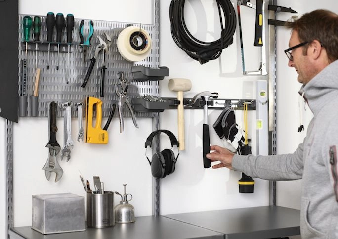 Dzięki zawieszonemu na ścianie systemowi Elfa wreszcie uda się utrzymać porządek w garażu. Dzięki dobrej organizacji przestrzeni twoje narzędzia, opony zimowe, meble ogrodowe czy rowery będą zawsze na swoim miejscu. We wnętrzu zapanuje harmonia, a ty zyskasz dodatkową przestrzeń, dzięki wolnej podłodze. Możesz samodzielnie zaplanować i zaprojektować przestrzeń, korzystając planera lub wybrać gotowe rozwiązania.