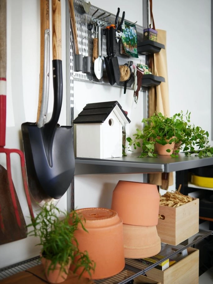 Dobrze zaplanowana przestrzeń to też mniej sprzątania, dzięki np. wentylowanym półkom. Umieść je najniżej i na nich przechowuj buty i narzędzia ogrodowe. Błoto i żwir opadną po wyschnięciu na podłogę, którą wystarczy zamieść. Na wolnej podłodze możesz umieścić blat roboczy do majsterkowania lub pielęgnacji roślin.