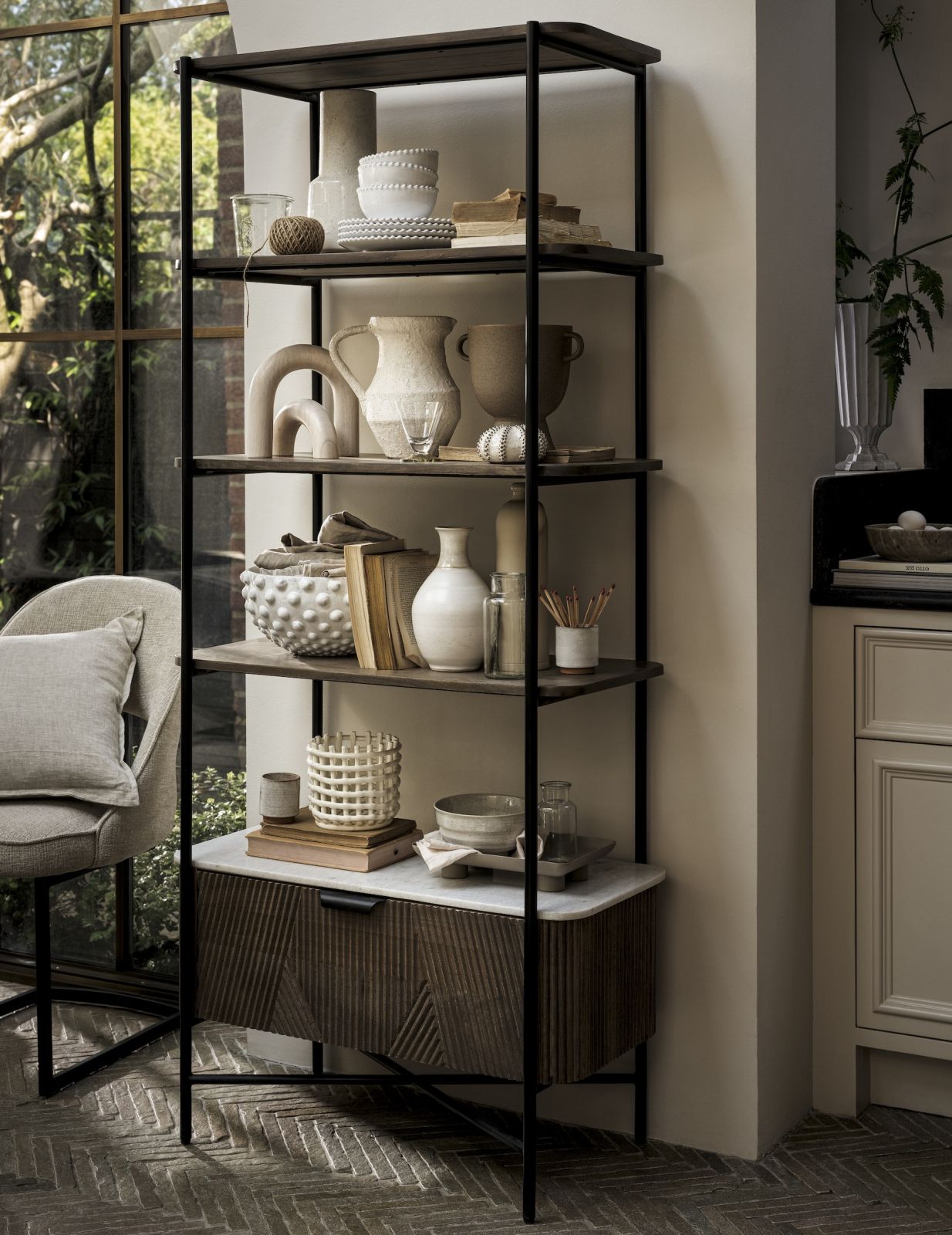 Coraz większą rolę odgrywają wolnostojące meble: stoły robocze, bloki rzeźnicze, kredensy i witryny. Naczynia nie są chowane – porcelana, ceramika i szkło stają się dekoracją wnętrza.